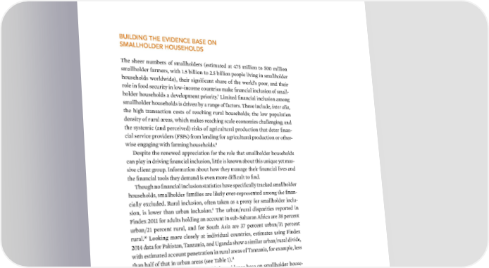 INTRODUCTION AND METHODOLOGY BUILDING THE EVIDENCE BASE ON SMALLHOLDER HOUSEHOLDS Œhe sheer numbers of smallholders (estimated at “•” million to ”’’ million smallholder farmers, with …” billion to ‘” billion people living in smallholder households worldwide), their significant share of the world’s poor, and their role in food security in low-income countries mae financial inclusion of small- • holder households a development priority ƒimited financial inclusion among smallholder households is driven by a range of factors Œhese include, inter alia, the high transaction costs of reaching rural households the low population density of rural areas, which maes reaching scale economies challenging and the systemic (and perceived) riss of agricultural production that deter finan- cial service providers (Ss) from lending for agricultural production or other- ¡ wise engaging with farming households ‰espite the renewed appreciation for the role that smallholder households can play in driving financial inclusion, little is nown about this uniue yet mas- sive client group €nformation about how they manage their financial lives and the financial tools they demand is even more difficult to find Œhough no financial inclusion statistics have specifically traced smallholder households, smallholder families are liely over-represented among the finan- cially excluded ªural inclusion, often taen as a proxy for smallholder inclu- ž sion, is lower than urban inclusion Œhe urban¤rural disparities reported in index ‘’…… for adults holding an account in sub-Saharan ˆfrica are Ÿ¡ percent urban¤‘… percent rural, and for South ˆsia are Ÿ• percent urban¤Ÿ… percent rural…’ ƒooing more closely at individual countries, estimates using index ‘’…“ data for aistan, Œan—ania, and ©ganda show a similar urban¤rural divide, with estimated account penetration in rural areas of Œan—ania, for example, less …… than half of that in urban areas (see Œable …) †‡ˆ has been woring to build the evidence base on smallholder house- holds as a first step in improving smallholders access to and uptae of a range of relevant financial tools Œo address the dearth of relevant data to guide financial inclusion interventions that target smallholder households, †‡ˆ launched two ma„or demand-side research initiatives with smallholder households to better understand their financial lives, agricultural activities, and household livelihood strategies () financial diaries with smallholder households (“Small- | 13