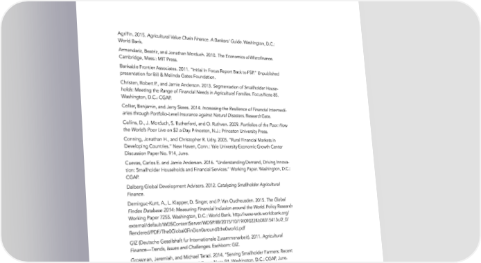 REFERENCES AgriFin. 2015. Agricultural Value Chain Finance. A Bankers’ Guide. Washington, D.C.: World Bank. Armendariz, Beatriz, and Jonathan Morduch. 2010. The Economics of Microfinance. Cambridge, Mass.: MIT Press. Bankable Frontier Associates. 2011. “Initial In Focus Report Back to FSP.” Unpublished presentation for Bill & Melinda Gates Foundation. Christen, Robert P., and Jamie Anderson. 2013. Segmentation of Smallholder House- holds: Meeting the Range of Financial Needs in Agricultural Families. Focus Note 85. Washington, D.C.: CGAP. Collier, Benjamin, and Jerry Skees. 2014. Increasing the Resilience of Financial Intermedi- aries through Portfolio-Level Insurance against Natural Disasters. ResearchGate. Collins, D., J. Morduch, S. Rutherford, and O. Ruthven. 2009. Portfolios of the Poor: How the World’s Poor Live on $2 a Day. Princeton, N.J.: Princeton University Press. Conning, Jonathan H., and Christopher R. Udry. 2005. “Rural Financial Markets in Developing Countries.” New Haven, Conn.: Yale University Economic Growth Center Discussion Paper No. 914, June. Cuevas, Carlos E. and Jamie Anderson. 2016. “Understanding Demand, Driving Innova- tion: Smallholder Households and Financial Services.” Working Paper. Washington, D.C.: CGAP. Dalberg Global Development Advisors. 2012. Catalyzing Smallholder Agricultural Finance. Demirguc-Kunt, A., L. Klapper, D. Singer, and P. Van Oudheusden. 2015. The Global Findex Database 2014: Measuring Financial Inclusion around the World. Policy Research Working Paper 7255. Washington, D.C.: World Bank. http://www-wds.worldbank.org/ external/default/WDSContentServer/WDSP/IB/2015/10/19/090224b08315413c/2_0/ Rendered/PDF/The0Global0Fin0ion0around0the0world.pdf GIZ (Deutsche Gesellshaft fur Internationale Zusammenarbeit). 2011. Agricultural Finance—Trends, Issues and Challenges. Eschborn: GIZ. Grossman, Jeremiah, and Michael Tarazi. 2014. “Serving Smallholder Farmers: Recent Developments in Digital Finance.” Focus Note 94. Washington, D.C.: CGAP, June. Hazell, P., C. Pomareda, and A. Valdés, eds. 1986. Crop Insurance for Agricultural Development. Issues and Experience. Baltimore: Johns Hopkins University Press. IFAD (International Fund for Agricultural Development). 2010. Rural Poverty Report 2011. Rome: IFAD. Kenya Financial Sector Deepening Trust. 2014. “Kenya Financial Diaries: Shilingi Kwa Shilingi—The Financial Lives of the Poor.” http://www.fsdkenya.org/new/our-work/ financial-diaries.html | 95