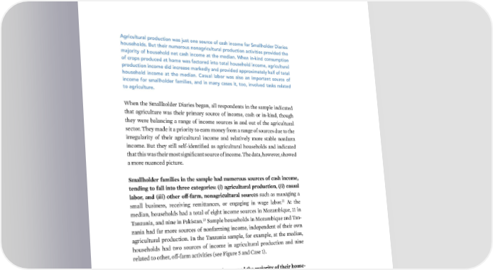 1. INCOME SOURCES AND THE ROLE OF IN-KIND CONSUMPTION Agricultural production was just one source of cash income for Smallholder Diaries households. But their numerous nonagricultural production activities provided the majority of household net cash income at the median. When in-kind consumption of crops produced at home was factored into total household income, agricultural production income did increase markedly and provided approximately half of total household income at the median. Casual labor was also an important source of income for smallholder families, and in many cases it, too, involved tasks related to agriculture. ™hen the Smallholder ‰iaries began, all respondents in the sample indicated that agriculture was their primary source of income, cash or in-ind, though they were balancing a range of income sources in and out of the agricultural sector Œhey made it a priority to earn money from a range of sources due to the irregularity of their agricultural income and relatively more stable nonfarm income £ut they still self-identified as agricultural households and indicated that this was their most significant source of income Œhe data, however, showed a more nuanced picture Smallholder families in the sample had numerous sources of cash income, tending to fall into three categories: (i) agricultural production, (ii) casual labor, and (iii) other off-farm, nonagricultural sources such as managing a ‘‘ small business, receiving remittances, or engaging in wage labor ˆt the median, households had a total of eight income sources in –o—ambiue, …… in Œan—ania, and nine in aistan‘Ÿ Sample households in –o—ambiue and Œan- —ania had far more sources of nonfarming income, independent of their own agricultural production €n the Œan—ania sample, for example, at the median, households had two sources of income in agricultural production and nine related to other, off-farm activities (see igure ” and †ase …) Families in the Smallholder Diaries also earned the majority of their house- hold net cash income from their numerous nonagricultural production actiities ˆmong the sample families, the median proportion of household net cash income (ie, revenue less any associated expenses, such as stoc purchases for side businesses) from nonagricultural production sources was žŸ percent in ‘“ –o—ambiue, •“ percent in Œan—ania, and ”¡ percent in aistan (see igure ”) ut focusing only on cash income underplays the importance of agriculture to smallholder households Œhe relative importance of agricultural produc- tion income increases maredly when household consumption of crops is | 29