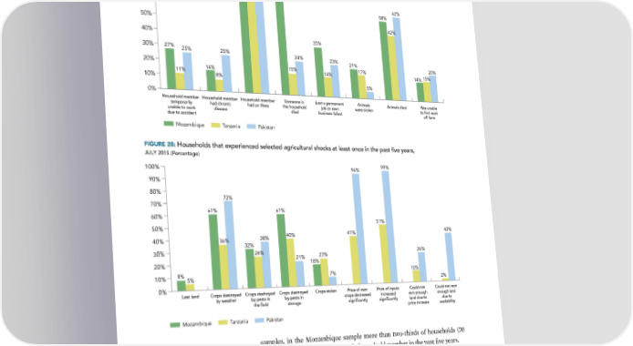54 | SMALLHOLDER DIARIES FIGURE 27: Households that experienced selected health and employment shocks at least once over past five years, JULY 2015 (Percentage) 100% 91% 90% 85% 80% 70% 70% 66% 62% 60% 58% 50% 42% 40% 35% 30% 27% 25% 25% 24% 23% 21% 20% 17% 20% 14% 15% 14% 14% 15% 11% 8% 10% 5% 0% Household member Household member Household member Someone in Lost a permanent Animals Animals died Was unable temporarily had chronic had an illnes the household job or own were stolen to find work unable to work disease died business failed off farm due to accident Mozambique Tanzania Pakistan FIGURE 28: Households that experienced selected agricultural shocks at least once in the past five years, JULY 2015 (Percentage) 100% 96% 99% 90% 80% 72% 70% 61% 61% 60% 51% 50% 43% 38% 40% 41% 40% 36% 32% 30% 26% 23% 26% 21% 18% 20% 10% 8% 7% 10% 5% 2% 0% Lost land Crops destroyed Crops destroyed Crops destroyed Crops stolen Price of own Price of inputs Could not Could not rent by weather by pests in by pests in crops decreased increased rent enough enough land the field storage significantly significantly land due to due to price increase availability Mozambique Tanzania Pakistan samples, in the –o—ambiue sample more than two-thirds of households (•’ percent) experienced the death of a household member in the past five years ‰ess commercialied smallholders e‡perienced more production-related shocƒs, while more commercialied households faced more marƒet-related ones (see igure ‘¡) ™eather-related shocs dealt ma„or hardships to families across the sample ¢… percent, Ÿ¢ percent, and •‘ percent of the samples in –o—ambiue, Œan—ania, and aistan, respectively, had a significant proportion (‘” percent or more) of a crop destroyed by weather in the past five years ests also presented a ma„or challenge œven among the sample in aistan, where