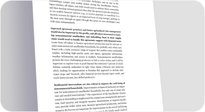 IMPLICATIONS FOR FINANCIAL SOLUTIONS | 81 his profile is liƒely the most challenging to sere ia mobile financial ser- ices, and successful approaches will need to oercome the barriers of lim- ited access to and capability with mobile phones Œhe experience and understanding of mobile phones in the –o—ambiue sample was the lowest in the Smallholder ‰iaries roughly half (”” percent) had used a phone in the past year and many new only how to receive calls with their phone (“” percent) ƒow levels of literacy, the lac of access to electricity to charge phones, and limited infrastructure presented additional challenges, and no one in the –o—ambiue sample used mobile money during the Smallholder ‰iaries €nput retailers, off-taers, and Ss would need to address these constraints and then develop tailored products that offer the option or provide incentives to use mobile financial services (eg, to receive payment, to contribute to a layaway account for inputs or an improved form of crop storage), perhaps in the near term through an agent (though this poses its own challenges) and, with time, independently Šmproed agronomic practices and better agricultural risƒ management would also be important in this profile, and off-taƒers interested in reach- ing noncommercial smallholders and embedding them in their supply chain would need to bundle this agronomic support with financial tools ƒoans from off-taers to finance agricultural production may be relevant to some noncommercial smallholder households, but probably only when com- bined with a fairly extensive range of support that enables some maretable surplus, including high-uality seeds and inputs, agronomic information, weather information, and access to marets ˜oncommercial smallholders present the most challenging producers to lin to value chains, and it will be important to explore ways to push beyond the estimated • percent of small- holders currently embedded in tight value chains (†hristen and ˆnderson ‘’…Ÿ), looing for opportunities to broaden this approach to include addi- tional crops and livestoc, offer financial services beyond input credit, and reach lower-income, less silled producers •onfinancial interentions are also critical to improe the well-being of noncommercial households €mprovements in financial inclusion are impor- tant for noncommercial smallholder households, but only one of many rele- “‘ vant and needed interventions Œhe experiences of the Smallholder ‰iaries sample in –o—ambiue emphasi—ed the connections among health and nutri- tion, food security, and irregular incomes €nterventions to improve health- care, provide wider safety nets, increase agricultural production, and better preserve the harvest are important for improvements in the overall well-being of noncommercial households ™hen someone in the family needs medical attention, for example, they cannot pay for transportation to a health clinic or hospital without cash on hand, which may prevent them from seeing care §ouchers that allowed bus and taxi drivers to receive payment from ˜‡¦s or the government for transportation to medical care could ease this constraint