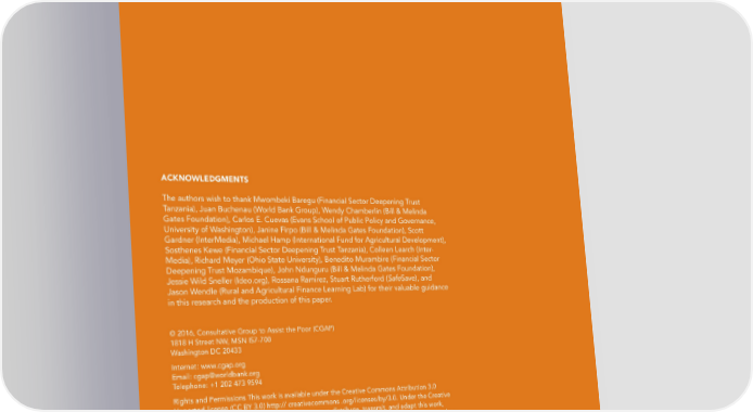 ACKNOWLEDGMENTS The authors wish to thank Mwombeki Baregu (Financial Sector Deepening Trust Tanzania), Juan Buchenau (World Bank Group), Wendy Chamberlin (Bill & Melinda Gates Foundation), Carlos E. Cuevas (Evans School of Public Policy and Governance, University of Washington), Janine Firpo (Bill & Melinda Gates Foundation), Scott Gardner (InterMedia), Michael Hamp (International Fund for Agricultural Development), Sosthenes Kewe (Financial Sector Deepening Trust Tanzania), Colleen Learch (Inter- Media), Richard Meyer (Ohio State University), Benedito Murambire (Financial Sector Deepening Trust Mozambique), John Ndunguru (Bill & Melinda Gates Foundation), Jessie Wild Sneller (Ideo.org), Rossana Ramirez, Stuart Rutherford (SafeSave), and Jason Wendle (Rural and Agricultural Finance Learning Lab) for their valuable guidance in this research and the production of this paper. © 2016, Consultative Group to Assist the Poor (CGAP) 1818 H Street NW, MSN IS7-700 Washington DC 20433 Internet: www.cgap.org Email: cgap@worldbank.org Telephone: +1 202 473 9594 Rights and Permissions This work is available under the Creative Commons Attribution 3.0 Unported license (CC BY 3.0) http:// creativecommons .org/licenses/by/3.0. Under the Creative Commons Attribution license, you are free to copy, distribute, transmit, and adapt this work, including for commercial purposes, under the following conditions: Attribution—Cite the work as follows: Anderson, Jamie, and Wajiha Ahmed. 2016. “Smallholder Diaries: Building the Evidence Base with Farming Families in Mozambique, Tanzania, and Pakistan.” Perspectives 2. Washington, D.C.: CGAP. License: Creative Commons Attribution CC BY 3.0 Translations—If you create a translation of this work, add the following disclaimer along with the attribution: This translation was not created by CGAP and should not be considered an official translation. CGAP shall not be liable for any content or error in this translation. All queries on rights and licenses should be addressed to CGAP Publications, 1818 H Street, NW, MSN IS7-700, Washington, DC 20433 USA; e-mail: cgap@world bank.org.