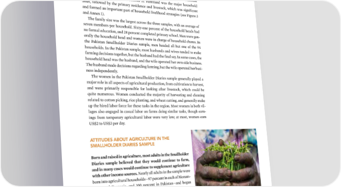 SAMPLE DEMOGRAPHICS AND AGRICULTURAL CHARACTERISTICS | 25 Œhe aistan sample universally grew wheat, and fodder to feed livestoc ˆ smaller percentage of households (…‘ percent) also grew vegetables, such as green chilies and ora –ost families cultivated rice (ž¢ percent) and about a third (Ÿ• percent) grew cotton –ost families had buffalos (¡ž percent) and more than half also raised goats (”” percent) Œhe median physical asset value in the aistan sample was significant ©S±…•,¢¢… However, financial net worth was negative -©S±“…’ at the median (the credit-heavy portfolio in the aistan sample is discussed more in Section ”) armland was the ma„or household asset, followed by the primary residence and livestoc, which was significant and formed an important part of household livelihood strategies (see igure Ÿ and ˆnnex …) Œhe family si—e was the largest across the three samples, with an average of seven members per household Sixty-one percent of the household heads had no formal education, and ‘¡ percent completed primary school –en were gen- erally the household head and women were in charge of household chores €n the aistan Smallholder ‰iaries sample, men headed all but one of the ž“ households €n the aistan sample, most husbands and wives tended to mae farming decisions together, but the husband had the final say €n some cases, the household head was the husband, and the wife operated her own side business Œhe husband made decisions regarding farming, but the wife operated her busi- ness independently Œhe women in the aistan Smallholder ‰iaries sample generally played a ma„or role in all aspects of agricultural production, from cultivation to harvest, and were primarily responsible for looing after livestoc, which could be uite numerous ™omen conducted the ma„ority of harvesting and cleaning related to cotton picing, rice planting, and wheat cutting, and generally mae up the hired labor force for these tass in the region –ost women in both vil- lages also engaged in casual labor on farms doing similar tass, though earn- ings from temporary agricultural labor were very low at most, women earn ©S±‘ to ©S±Ÿ per day ATTITUDES ABOUT AGRICULTURE IN THE SMALLHOLDER DIARIES SAMPLE orn and raised in agriculture, most adults in the Smallholder Diaries sample belieed that they would continue to farm, and in many cases would continue to supplement agriculture with other income sources ˜early all adults in the sample were born into agricultural households—ž• percent in each of –o—am- biue and Œan—ania, and …’’ percent in aistan—and began woring in agriculture at a young age ˆmong the Smallholder ‰iaries participants in –o—ambiue, their two most important aspirations were building a sturdy house out of uality materials (¢¢ percent) and improving their farm (”• percent) providing an education for their children was a relatively low priority Œhe more commercially active smallhold- ers in the Œan—ania and aistan samples viewed expanding or improving their farm as a top life goal (•“ percent and ¢ž percent, Photo by Mwangi Kiribi.