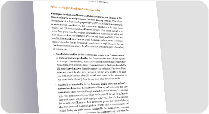 EXECUTIVE SUMMARY | 3 ut focusing only on cash income underplays the importance of agriculture to smallholder households Œhe relative importance of agricultural production income increases maredly when household consumption of crops is included in the analysis (see igure œS-…) €n the sample in Œan—ania and aistan, the median proportion of household income derived from crop production increased from ‘¢ percent to “¢ percent and “‘ percent to ”Ÿ percent, respec- tively, when also considering in-ind consumption £ut the difference is most dramatic in –o—ambiue, „umping from • percent to “ž percent Patterns of agricultural production and sales he degree to which smallholders sold their production and the pace of this monetiation aries sharply across the three country samples Œhis echoes the segmentation framewor proposed by †‡ˆ that differentiates among (i) noncommercial smallholders, (ii) commercial smallholders in loose value chains, and (iii) commercial smallholders in tight value chains according to what they grow, how they engage with marets as buyers and¤or sellers, and how those marets are organi—ed (†hristen and ˆnderson ‘’…Ÿ) €f and how smallholder households consume or sell their crops and the nature of their con- nections to value chains, for example, have important implications for the roles that financial tools can play in their lives and how they are tailored to household circumstances • Smallholder families in the oambi ue sample were “net consumers” of their agricultural production (ie, they consumed more of their agricul- tural output than they sold) Œhese were largely noncommercial smallholder households, with limited sales of crops and livestoc ˆnd many households did not sell anything over the entire year of data collection Œhey were able to consume smoothly what they produced, but they were unable to do much else with their harvest Œhey did not sell their crops for the cash needed to buy other foods, diversify their diet, or meet other household needs • Smallholder households in the anania sample were “net sellers” in loose alue chains (ie, they sold more of their agricultural output than they consumed) Œhese households typically had one ma„or harvest of a cash crop (eg, rice, potatoes) each year, which would typically be sold for cash to vil- lage-level agents and¤or larger aggregating buyers ˆ few sold direct to mar- et as well ¦verall, sales of their agricultural production were fairly lumpy (ie, they occurred in distinct periods over the year, not continuously) and spied during the main harvest Households also stored crops, consuming some proportion of some of them over time, and moneti—ing them when they needed cash • Smallholder households in the ‚aƒistan sample were net sellers in tight alue chains, consuming an even smaller proportion of their production than in the Œan—ania sample ˆfter each ma„or harvest in ˜ovember and in –ay, they were usually obliged to sell their output immediately bac to the middleman to repay debts for the costly agricultural inputs they had financed