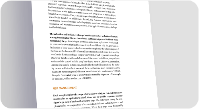 RISK MITIGATION AND COPING STRATEGIES | 55 the use of pesticides was universal, Ÿ¡ percent of smallholder households reported significant in-field crop loss due to pests ˆmong the largely noncommercial –o—ambiue sample, where the use of inputs and sale of outputs was minimal, production riss were paramount ˆbout one-third of these households had experienced significant in-field crop loss due to pests (Ÿ‘ percent) ˆfter the harvest households needed to store crops for many months to cover their own food consumption, and close to two-thirds of the sam- ple (¢… percent) had lost crops in storage due to contamination from pests or the more commercial smallholders in the aistan sample, maret riss presented a greater concern than production riss §irtually every household had been affected by increases in the price of inputs and decreases in crop sales £ut crop loss in the aistan sample was much lower than in –o—ambiue, largely for two reasons irst, a ma„or proportion of the harvest in aistan was immediately handed to middlemen Second, the aistani respondents used more secure means of storage, including tin and aluminum containers, than the Œan—anian and –o—ambican respondents, who typically stored crops in bags inside their house he aluation and incidence of crops lost due to weather and other disasters among Smallholder Diaries households in oambi ue and ‚aƒistan were remarƒably large ˆttaching an estimated value to an agricultural shoc, such as how much crops that had been destroyed would have sold for, provides an indication of their perceived value across the sample and the relative impact of Ÿ… the loss on the household Œhe median estimated cost of crops destroyed by weather in the –o—ambiue sample was ©S±ž‘, which represents a very large shoc for families with such low overall incomes €n aistan, respondents estimated the cost of in-field crop loss due to pests at ©S±”’’ at the median ˆmong the sample in Œan—ania, smallholder households considered the inabil- ity to rent sufficient land as one of their costliest and most common negative events “¡ percent reported this as an issue that carried a median cost of ©S±“¢” ‰rops in the maret price of crops was also named by Ÿ¢ percent of the sample in Œan—ania, with a median cost of ©S±‘”¡ RISK MANAGEMENT †ach sample employed a range of strategies to mitigate risƒ, but most com- monly after an agricultural shocƒ there was no specific response, possibly signaling a lacƒ of tools with which to cope Œhe differences among the sam- ples revealed varying degrees of access to financial tools and safety nets, as well as their degree of maret engagement ™hen their crops were destroyed by weather, for example, many Œan—anian households in the Smallholder ‰iaries sample did nothing, which could reflect an apparent lac of perceived fallbac options and¤or a lower impact of weather-related shocs (see igure ‘ž) ™hen the sample in aistan faced the same situation, some smallholder households borrowed money (Ÿ¡ percent), and about one-third also had no specific coping response (Ÿ“ percent) Œheir range of active responses indicates both access to a more robust financial portfolio, the central role of agricultural production in their household livelihood strategy, and, in most cases, a contractual obligation to fulfill ™hen households rely on agricultural production for income and to