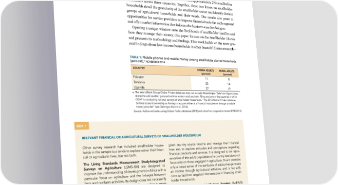14 | SMALLHOLDER DIARIES …‘ holder ‰iaries”) and (ii) nationally representative household surveys and seg- …Ÿ mentations of the smallholder sector Œhese are two complementary research methods Œhe national surveys, which administer a household uestionnaire to a nationally representative sam- ple of about Ÿ,’’’ smallholder households in each country, are wide, while the Smallholder ‰iaries are deep, with a year of very detailed data collection on all income sources, expenditures, and shocs with approximately ‘•’ smallholder households across three countries Œogether, these two lenses on smallholder households detail the granularity of the smallholder sector and identify distinct groups of agricultural households and their needs Œhe results also point to opportunities for service providers to improve financial tools for each segment and offer maret information that informs the business case for doing so ¦pening a uniue window onto the livelihoods of smallholder families and how they manage their money, this paper focuses on the Smallholder ‰iaries and presents its methodology and findings Œhis wor builds on the more gen- eral findings about low-income households in other financial diaries research— TABLE 1: Mobile phones and mobile money among smallholder diaries households (percent),a NOVEMBER 2014 COUNTRY URBAN ADULTS RURAL ADULTS (percent) (percent) Pakistan 11 8 Tanzania 33 14 Uganda 27 19 a. The World Bank Group Global Findex database does not include Mozambique. Data from Uganda was shared to add another perspective from eastern and southern Africa and one of the countries in which CGAP is conducting national surveys of smallholder households. “The 2014 Global Findex database defines account ownership as having an account either at a financial institution or through a mobile money provider” (see Demirguc-Kunt et al. 2014). Source: Author estimates using Global Findex database (2014) and urban/rural population shares (IFAD 2010). BOX 1 RELEVANT FINANCIAL OR AGRICULTURAL SURVEYS OF SMALLHOLDER HOUSEHOLDS Other survey research has included smallholder house- given country source income and manage their financial holds in the sample but tends to explore either their finan- lives and to explore attitudes and perceptions regarding cial or agricultural lives, but not both. financial products and services. It is designed to be repre- The Living Standards Measurement Study-Integrated sentative of the adult population of a country and does not Surveys on Agriculture (LSMS-ISA) are designed to focus only on those engaged in agriculture, thus it provides improve the understanding of development in Africa with a only a broad sense of the attributes of adults that generate particular focus on agriculture and the linkages between an income through agricultural activities, and is not suffi- farm and nonfarm activities. Its design does not necessarily cient to facilitate targeted interventions in financing small- result in a subsample of smallholder farmers that is repre- holder households. sentative of the population of smallholder famers in a coun- The Agricultural Financial Markets Scoping (AgFiMS) try (although most of the participants in the survey might be diagnostic on financial services in the agricultural sector smallholder farmers) and though the questionnaire gener- includes a comprehensive, nationally representative survey ally asks about access to credit, it does not provide a thor- tool focusing on potentially commercially viable agricultural ough understanding of the access to or use of a wider enterprises, including producers, processors, and service spectrum of financial services or delve deeply into small- providers, which orients the survey sample toward a focus holder attitudes and financial decision-making. on the top-end of the agribusiness market (in terms of The FinScope consumer survey developed by FinMark annual turnover) and therefore excludes the majority of Trust is designed to provide insights into how adults in a smallholder farmers.
