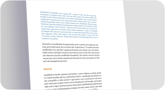 CASE 3, continued 4. RISK MITIGATION AND COPING STRATEGIES Smallholder households were coping with a range of risks, and the ways they attempted to mitigate these risks and how they coped with shocks reflect the breadth of their financial portfolio and market relationships. Less commercialized smallholders experienced more production-related shocks, while more commer- cialized households faced more market-related ones. Smallholder Diaries house- holds also faced the health and employment shocks common to all families. These not only depleted their financial, emotional, and human resources, but also dis- rupted their agricultural activities. Each sample employed a range of strategies to mitigate risk, but most commonly after an agricultural shock there was no spe- cific response, which could signal a lack of tools with which to cope. Over the 12 months of data collection, Smallholder Diaries households reported no use of insurance of any kind. ˆll profiles of smallholder farming families need a myriad ris mitigation solu- Ÿ’ tions, particularly given the covariant riss of agriculture Œo explore the riss smallholders face and their coping mechanisms once shocs occur, the Small- holder ‰iaries included a module of uestions focused on the riss, agricultural and otherwise, faced by smallholder households Œhe module covered attitudes toward ris, actual shocs experienced in the past five years, perception of riss, and ris management practices SHOCKS €n addition to shocs common to all families—such as sicness, accidents, death of a family member, „ob loss, and business failure—smallholder households are also susceptible to riss related to agriculture, such as production riss from pests and ma„or weather events such as flooding, hail, and drought, and maret riss such as input and harvest price fluctuations Smallholder households may employ a range of ris mitigation strategies, but they cannot always cope when shocs or disasters hit, especially given their limited financial portfolios Smallholders faced common health and employment shocƒs that not only depleted household financial, emotional, and human resources, but also dis- rupted agricultural actiities (see igure ‘•) €f a household member was sic during harvest, for example, a household may need to hire labor, cutting into their already thin net income and¤or harvest Some respondents in the Œan—ania sample reported woring through illness and in„ury so as not to miss fieldwor, though this aggravated their condition ™hile illness was common in all three | 53