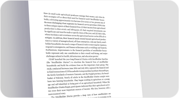 EXECUTIVE SUMMARY How do small-scale agricultural producers manage their money, and what do their strategies tell us about their need for financial tools? Smallholder house- holds, cultivating approximately two hectares (five acres) or less, present one of the most challenging client segments for financial service providers (Ss) due to three uniue aspects of their financial lives (i) their income from agricultural production is often erratic and infreuent (ii) their reuired investments can be significant and must be made at specific times of the year and (iii) their riss, whose incidence and covariance across the agricultural sector can be difficult to mitigate €n addition, their financial needs extend beyond agricultural produc- tion to a variety of nonagricultural, off-farm enterprises ƒie any family, small- holder households also need a range of financial tools to meet regular expenses, respond to emergencies, and finance milestones such as weddings and funerals urthermore, improvements to the financial portfolios of smallholder house- holds represent only one contribution to their overall well-being, and ma„or … challenges related to health, infrastructure, and education persist †‡ˆ launched the year-long inancial ‰iaries with Smallholder amilies (the “Smallholder ‰iaries”) to elucidate the financial lives of smallholder households and build the evidence base on this important client group Œhe study, conducted between Žune ‘’…“ and Žuly ‘’…”, captured the financial and in-ind transactions of ‘•’ households in impoverished northern –o—ambiue, the fertile farmlands of western Œan—ania, and the un„ab province, the bread- baset of aistan ˜early all adults in the Smallholder ‰iaries sample were born into farming households Œhey began woring in agriculture at a young age and self-identified as being part of an agricultural household ™hen the Smallholder ‰iaries began, participants indicated that their agricultural activi- ties were their most important sources of income Œhe data, however, told a more nuanced story Œhe Smallholder ‰iaries provide a deep view of how smallholders are affected by the agricultural cycle and manage their money in response to its ebbs and flows, as well as point to ways that Ss might better meet smallhold- ers’ needs ™hile the Smallholder ‰iaries methodology and sample si—e are not statistically representative of all smallholder families in a given country, the findings from the Smallholder ‰iaries have global implications for the small- holder household sector Œhe sample of smallholder households from each study country has characteristics that are broadly representative of the types of smallholder segments identified in countries around the world, which presents an opportunity to discuss the types of financial tools that these segments demand regardless of their location | 1