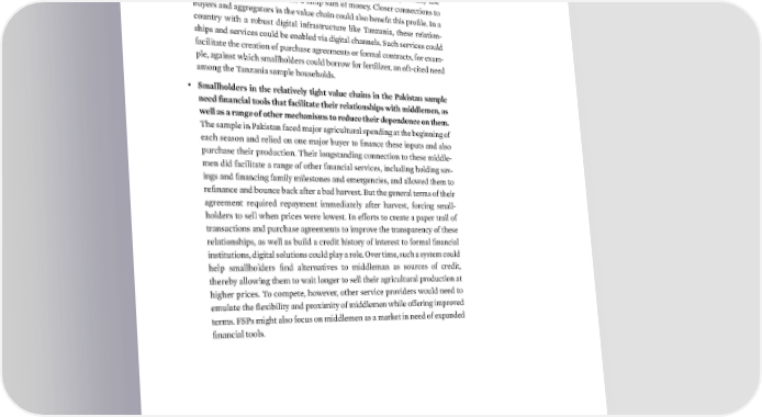 EXECUTIVE SUMMARY | 11 standing of the dynamics of household cash flows in this profile could also provide comfort to both Ss and borrowers alie by demonstrating that cer- tain forms of agricultural lending may not be as risy as previously perceived, or that they are at least mitigated by other less volatile sources of income outside of agricultural production ªelatively higher-income (or somewhat less poor) households lie those in the Œan—ania sample can also more suc- cessfully postpone crop sales to wait for a better price or purposefully use their stored crops to “save” for a lump sum of money †loser connections to buyers and aggregators in the value chain could also benefit this profile €n a country with a robust digital infrastructure lie Œan—ania, these relation- ships and services could be enabled via digital channels Such services could facilitate the creation of purchase agreements or formal contracts, for exam- ple, against which smallholders could borrow for fertili—er, an oft-cited need among the Œan—ania sample households • Smallholders in the relatiely tight alue chains in the ‚aƒistan sample need financial tools that facilitate their relationships with middlemen, as well as a range of other mechanisms to reduce their dependence on them Œhe sample in aistan faced ma„or agricultural spending at the beginning of each season and relied on one ma„or buyer to finance these inputs and also purchase their production Œheir longstanding connection to these middle- men did facilitate a range of other financial services, including holding sav- ings and financing family milestones and emergencies, and allowed them to refinance and bounce bac after a bad harvest £ut the general terms of their agreement reuired repayment immediately after harvest, forcing small- holders to sell when prices were lowest €n efforts to create a paper trail of transactions and purchase agreements to improve the transparency of these relationships, as well as build a credit history of interest to formal financial institutions, digital solutions could play a role ¦ver time, such a system could help smallholders find alternatives to middleman as sources of credit, thereby allowing them to wait longer to sell their agricultural production at higher prices Œo compete, however, other service providers would need to emulate the flexibility and proximity of middlemen while offering improved terms Ss might also focus on middlemen as a maret in need of expanded financial tools