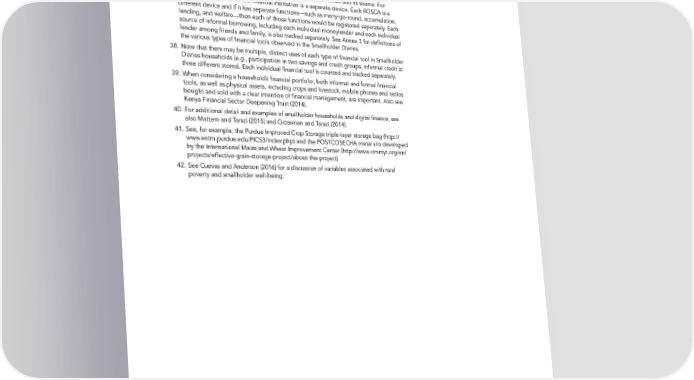 NOTES | 99 33. An interesting experience evolving in Kenya is the e-warehouse system that records onsite storage and allows its use as collateral against short-term loans (See http://www. grameenfoundation.org/what-we-do/financial-services/agricultural-finance),. 34. The other question posited by Walker and Jodha refers to the effect of risk-management methods on static and dynamic social efficiency, which (if detrimental), would justify public policy for the sake of social welfare. 35. See for example Armendariz and Morduch (2010). 36. See Miranda (2009) and Collier and Skees (2014). 37. Note that each tool is distinguished by both its financial function and its source. For example, each account at a financial institution is a separate device. Each ROSCA is a different device and if it has separate functions—such as merry-go-round, accumulation, lending, and welfare—then each of those functions would be registered separately. Each source of informal borrowing, including each individual moneylender and each individual lender among friends and family, is also tracked separately. See Annex 3 for definitions of the various types of financial tools observed in the Smallholder Diaries. 38. Note that there may be multiple, distinct uses of each type of financial tool in Smallholder Diaries households (e.g., participation in two savings and credit groups, informal credit at three different stores). Each individual financial tool is counted and tracked separately. 39. When considering a household’s financial portfolio, both informal and formal financial tools, as well as physical assets, including crops and livestock, mobile phones and radios bought and sold with a clear intention of financial management, are important. Also see Kenya Financial Sector Deepening Trust (2014). 40. For additional detail and examples of smallholder households and digital finance, see also Mattern and Tarazi (2015) and Grossman and Tarazi (2014). 41. See, for example, the Purdue Improved Crop Storage triple-layer storage bag (http:// www.entm.purdue.edu/PICS3/index.php) and the POSTCOSECHA metal silo developed by the International Maize and Wheat Improvement Center (http://www.cimmyt.org/en/ projects/effective-grain-storage-project/about-the-project). 42. See Cuevas and Anderson (2016) for a discussion of variables associated with rural poverty and smallholder well-being.