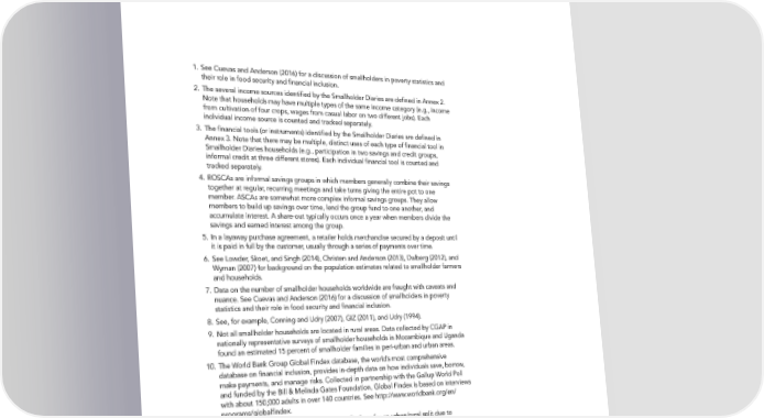 NOTES 1. See Cuevas and Anderson (2016) for a discussion of smallholders in poverty statistics and their role in food security and financial inclusion. 2. The several income sources identified by the Smallholder Diaries are defined in Annex 2. Note that households may have multiple types of the same income category (e.g., income from cultivation of four crops, wages from casual labor on two different jobs). Each individual income source is counted and tracked separately. 3. The financial tools (or instruments) identified by the Smallholder Diaries are defined in Annex 3. Note that there may be multiple, distinct uses of each type of financial tool in Smallholder Diaries households (e.g., participation in two savings and credit groups, informal credit at three different stores). Each individual financial tool is counted and tracked separately. 4. ROSCAs are informal savings groups in which members generally combine their savings together at regular, recurring meetings and take turns giving the entire pot to one member. ASCAs are somewhat more complex informal savings groups. They allow members to build up savings over time, lend the group fund to one another, and accumulate interest. A share-out typically occurs once a year when members divide the savings and earned interest among the group. 5. In a layaway purchase agreement, a retailer holds merchandise secured by a deposit until it is paid in full by the customer, usually through a series of payments over time. 6. See Lowder, Skoet, and Singh (2014), Christen and Anderson (2013), Dalberg (2012), and Wyman (2007) for background on the population estimates related to smallholder farmers and households. 7. Data on the number of smallholder households worldwide are fraught with caveats and nuance. See Cuevas and Anderson (2016) for a discussion of smallholders in poverty statistics and their role in food security and financial inclusion. 8. See, for example, Conning and Udry (2007), GIZ (2011), and Udry (1994). 9. Not all smallholder households are located in rural areas. Data collected by CGAP in nationally representative surveys of smallholder households in Mozambique and Uganda found an estimated 15 percent of smallholder families in peri-urban and urban areas. 10. The World Bank Group Global Findex database, the world’s most comprehensive database on financial inclusion, provides in-depth data on how individuals save, borrow, make payments, and manage risks. Collected in partnership with the Gallup World Poll and funded by the Bill & Melinda Gates Foundation, Global Findex is based on interviews with about 150,000 adults in over 140 countries. See http://www.worldbank.org/en/ programs/globalfindex. 11. The Findex 2014 database does not report findings for an urban/rural split due to inconsistencies in the definitions of urban and rural across countries, although it includes estimates for account penetration in rural populations. The database effectively does have these estimates; Table 1 was generated using those estimates, and extrapolating the urban account penetration using rural population shares from IFAD Poverty Report (2010). 12. CGAP retained the services of Bankable Frontier Associates (BFA) to manage the Smallholder Diaries. For in-country data collection, BFA worked with International Capital Corporation in Mozambique, Digital Divide Data in Tanzania, and RCons in Pakistan. 13. CGAP retained the services of InterMedia to manage the national surveys of smallholder households, and it worked with Ipsos in Mozambique and Uganda for in-country data collection. National surveys and segmentations of the smallholder sector are also underway in Tanzania, Côte d’Ivoire, and Bangladesh, and results and data from all five countries will be published in 2016. | 97