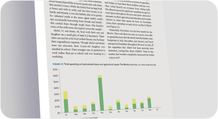 76 | SMALLHOLDER DIARIES CASE 6 RELYING ON CREDIT IN MONTHS BETWEEN HARVEST: THE BHATTIS (PAKISTAN) Œhe experience of ˆbdul and ªania £hatti, one of the Œhe £hattis grew two main crops, rice in ˜ovem- Smallholder ‰iaries households in aistan, demon- ber and wheat in –ay, as well as a variety of vegetables strates how families in this sample used their relatively and fodder to feed their three buffalos and one cow broad financial portfolio to access goods and cash when Œhey relied heavily on revenues from selling mil they needed it most ™hile the family had savings both Œhe £hattis incurred significant spending on agricul- at home and with its arthi, and also lent money to its tural inputs throughout the year and spent substantial family and friends, it was the liability side of its portfo- amounts on their agricultural production each month lio—informal credit at the store, agent (arthi) credit, relative to what they spent on food €n ˜ovember and occasionally borrowing from friends and family— alone, their spending on agriculture reached ©S±””ž that carried them through tough times Œhe family’s (see igure Ÿ•) views of the arthi were also typical across the sample inancially, ˜ovember was the best month for the ˆbdul, ”•, and ªania, “¡, lived with their son and £hattis Œhey sold their rice and, as a result, were able daughter on a small plot of land (…‘ hectares) Œheir to spend the most £ut the family had the hardest time older son and his wife lived in their house, too, but ept budgeting in Žuly, ‰ecember, and Žanuary, and faced their expenditures separate Œhough ˆbdul and ªania unexpected hardships throughout the year €n Žuly, all were not educated, their ……-year-old daughter was the vegetables that ˆbdul had been growing were enrolled in school Œheir younger son, …Ÿ, preferred to destroyed, costing him about ©S±”’‘ Œhen in Sep- wor rather than go to school and was training in a tember, bad weather completely destroyed the fodder worshop crop as well FIGURE 37: Total spending on food-related items and agricultural inputs: The Bhattis (PAKISTAN), JULY 2014–JUNE 2015 (US$) $700 $600 $500 $400 $300 $200 $100 $0 Jul Aug Sep Oct Nov Dec Jan Feb MarApr May Jun Seeds, fertilizer and agricultural equipment Groceries and cooked food