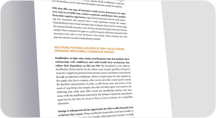 IMPLICATIONS FOR FINANCIAL SOLUTIONS | 83 ‘‡ payments could present other use cases for formal financial services or mobile payments ”loser connections to buyers and aggregators in the alue chain could also benefit this profile, and in countries such as anania that hae a robust dig- ital infrastructure, these relationships and serices could be enabled ia digital channels Such services could facilitate the creation of purchase agree- ments or formal contracts, for example, against which smallholders could bor- row for fertili—er, an oft-cited need among the Œan—ania sample households FS‚s that offer any type of insurance would need to demonstrate its alue ery early on to build trust, counter scepticism, and distance their product from other negatie e‡periences ˆgricultural insurance may be worth explor- ing, but insurance and insurers had a wea reputation among the sample Households are wary of any insurance due to reports of poor service when using the national health insurance card Stories abound among the Œan—ania ‰iaries sample where someone has gone to a public hospital with their national health insurance card, only to wait for hours to be served, while someone else who pays for services in cash is immediately assisted SOLUTIONS FOR SMALLHOLDERS IN TIGHT VALUE CHAINS: ENGAGING MIDDLEMEN, CHANNELING SAVINGS Smallholders in tight alue chains need financial tools that facilitate their relationships with middlemen and could benefit from mechanisms that reduce their dependence on this one FS‚ Œhe households in the aistan Smallholder ‰iaries had by far the widest, most complex portfolio of financial tools, but a significant portion of their income sources and financial tools flowed through an individual middleman Œhere is clearly space for more options on the supply side, but to compete, other service providers would need to match the flexibility and proximity of arthis, or offer better terms and service €n the event of crop failure, for example, the arthi will liely agree to be repaid in the following year, while most Ss would not Smallholder families may have issues with the middleman, particularly the timing of repayment immediately upon harvest, but they do return to them, at least in absence of a compelling alternative Saings is widespread and the opportunity for FS‚s to offer financial tools to harness this is great ™hen smallholder households saved from ¦ctober to ˜ovember and ˆpril to –ay, for example, when agricultural income was high, the largest share of these savings went to arthis or to savings in the house, and of course neither earned any interest Šn addition to proiding financial serices alternaties to the middlemen, greater transparency could strengthen and better balance the arthi–small- holder relationship Smallholders could benefit from a short-term loan to repay arthi debt and obtain inputs elsewhere, which would also allow breathing room to tae advantage of price increases as time passes after harvest œven when savings are ept with the arthi, digital finance and tools may help farmers