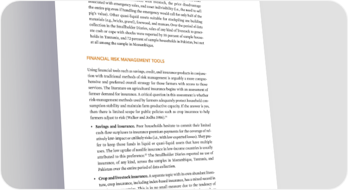 RISK MITIGATION AND COPING STRATEGIES | 59 • Sale of assets, mainly liestocƒ ˆfter nonfarm employment, using livestoc as uasi-liuid assets that can be converted into liuid assets to compensate for crop losses or cope with unexpected shocs such as medical emergencies is an important ris management tool Stocpiling basic assets, therefore, is the corresponding ris-prevention method, and temporary surpluses are usually “invested” in assets that can be easily liuidated, such as small live- stoc (eg, goats, pigs, chicens) Œhe limitations of this strategy stem from the mortality¤loss rates associated with livestoc, the price disadvantage associated with emergency sales, and asset indivisibility (ie, the need to sell the entire pig even if handling the emergency would call for only half of the pig’s value) ¦ther uasi-liuid assets suitable for stocpiling are building materials (eg, brics, gravel), firewood, and manure ¦ver the period of data collection in the Smallholder ‰iaries, sales of any ind of livestoc to gener- ate cash or cope with shocs were reported by ”” percent of sample house- holds in Œan—ania, and •‘ percent of sample households in aistan, but not at all among the sample in –o—ambiue FINANCIAL RISK MANAGEMENT TOOLS ©sing financial tools such as savings, credit, and insurance products in con„unc- tion with traditional methods of ris management is arguably a more compre- hensive and preferred overall strategy for those farmers with access to those services Œhe literature on agricultural insurance begins with an assessment of farmer demand for insurance ˆ critical uestion in this assessment is whether ris-management methods used by farmers adeuately protect household con- sumption stability and maintain farm productive capacity €f the answer is yes, then there is limited scope for public policies such as crop insurance to help Ÿ“ farmers ad„ust to ris (™aler and Žodha …ž¡¢) • Saings and insurance oor households hesitate to commit their limited cash-flow surpluses to insurance premium payments for the coverage of rel- atively low-impact or unliely riss (ie, with low expected losses) Œhey pre- fer to eep those funds in liuid or uasi-liuid assets that have multiple uses Œhe low uptae of nonlife insurance in low-income countries is usually Ÿ” attributed to this preference Œhe Smallholder ‰iaries reported no use of insurance, of any ind, across the samples in –o—ambiue, Œan—ania, and aistan over the entire period of data collection • ”rop and liestocƒ insurance ˆ separate topic with its own abundant litera- ture, crop insurance, including index-based insurance, has a mixed record in low-income countries Œhis is in no small measure due to the tendency of governments to intervene in the presence of systemic shocs, such as droughts, floods, or pests, and totally or partially relieve farmers of all obliga- tions (interest and principal) with regard to their creditors Œhe incentives for farmers to purchase insurance are therefore minimal, and more successful efforts to extend insurance rely on bundling the insurance with the purchase of seeds or fertili—er Œhe case for financial institutions to purchase index- based insurance has been convincingly made by –iranda (‘’’ž), since their nonperforming loans would drastically and almost immediately increase in Ÿ¢ the event of systemic weather-based shocs