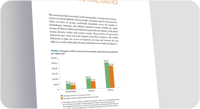 SAMPLE DEMOGRAPHICS AND AGRICULTURAL CHARACTERISTICS Œhis section provides more detail on the demographics and agricultural charac- teristics of each Smallholder ‰iaries sample, setting the stage for the results that follow €n terms of income, smallholder households across the samples in –o—ambiue, Œan—ania, and aistan reported average monthly per capita income of ©S±””¢, ©S±…’, and ©S±‘”žž, respectively (see igure ‘), with added income diversity within each country sample †haracteristics of agricultural production also varied across the samples in the three countries, with mared differences in input use, access to irrigation, and crop and livestoc mix (see Œable Ÿ), as well as their physical assets and financial net worth (see igure Ÿ) a FIGURE 2: Average monthly income and consumption (operational expenditures) per capita b (US$) $30.00 $25.99 $25.00 $22.49 $20.00 $15.00 $10.00 $10.00 $7.33 $5.56 $4.18 $5.00 0 Mozambique Tanzania Pakistan Average monthly net income per capita Average monthly household expenditures per capita a. Consumption here includes all operational expenses. It does not include stock purchases for self-owned businesses or farming expenses related to agricultural production. Consumption here does not include in-kind consumption of production from their own farms (these data are covered later in the report). Per capita calculations were derived by dividing by the number of people in the household. b. The timeframes for observations are not exactly the same for every sample and household. In some areas and with some households, the Smallholder Diaries started slightly earlier than others. | 21