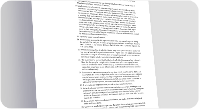 98 | SMALLHOLDER DIARIES 14. Key sources on the diaries methods and findings are Collins et al. (2009) and Kenya Financial Sector Deepening Trust (2014). Other references indicated as appropriate. 15. All data were collected between April 2014 and July 2015, including the initial question- naires and additional qualitative modules. Data collection on household cash flows started in June 2014 and ended in June 2015. The module on risk was administered in July 2015. 16. All data and questionnaires are available at http://www.cgap.org/topics/financial-innova- tion-smallholder-families. 17. “In-kind” refers to goods, services, and transactions not involving money (i.e., payments in-kind, barter transactions). 18. The Financial Diaries methodology was developed by David Hulme of the University of Manchester and Stuart Rutherford of SafeSave. 19. Smallholders Diaries households were selected purposefully and not randomly, and the samples are not statistically representative of smallholder farmers in these areas or in the three countries. There are additional reasons the Diaries methodology does not use a random sample. The study is able to include only households that are willing to commit to a year-long study and, to minimize attrition issues, are likely to stay in the community. Households initially oversampled to include 286 households and the study ended with 273. Households left the study by leaving the study villages, seasonal migration, and occasionally by the prompting of the research team due to concerns about the house- hold’s willingness to be forthcoming about important sources of income. The research firms provided small cash gifts at surprise times throughout the study to thank respon- dents for their participation. The value of these cash gifts were a very small share of income for most households. The gifts were tracked as income and expenditures enabled by these extra inflows were also tracked. 20. Figures for assets were self-reported. 21. The exchange rates used in this paper, calculated as the average exchange rate during the period of the study, are as follows unless otherwise indicated: Mozambique Metical to the U.S. Dollar: 34.66; Tanzania Shilling to the U.S. Dollar: 1934.72; Pakistan Rupee to the U.S. Dollar: 99.60. 22. In the terminology of the Smallholder Diaries, wage labor generates salaried income that has been at least tacitly agreed to be earned on a regular basis. This is distinct from casual labor, which is irregular income from short-term employment, such as work on construc- tion sites or helping with the harvest on other people’s farms. 23. The several income sources identified by the Smallholder Diaries are defined in Annex 2. Note that there may be multiple, distinct income streams from each type of income source in Smallholder Diaries households (e.g., income from cultivation of four crops, wages from casual labor on two different jobs). Each individual income source is counted and tracked separately. 24. Some income sources even go negative in a given month, since the Diaries charted net income from the source. In agriculture production and self-employment, some expenses may be incurred before revenue, resulting in negative net income for a given month. While agricultural revenues in Pakistan can be high, agricultural income is calculated by subtracting farming expenses, which can be substantial, from gross revenue. 25. This includes any crops consumed, traded, or given away for any reason. 26. In the Smallholder Diaries a distinction was made between self-generated agricultural production income and income from casual labor related to agriculture (e.g., working on a neighbor’s farm). Someone providing casual labor is not the main decision-maker or investor in those crops or livestock and their work starts and stops at the will of someone outside the household. 27. For a detailed exploration of value chain finance, see AgriFin 2015 (forthcoming) and Miller and Jones (2010). 28. Commercial smallholders in tight value chains have the capacity to generate reliable, high- quality outputs that are sold on a contract basis through relatively highly organized value chains. See Christen and Anderson (2013). 29. The village in the Tanzania sample focused on potato production had the same pattern, with expenses dipping to their lowest during hardship months. 30. Covariant risk arises when many households in one area are adversely affected by a single phenomenon such as a natural disaster, epidemic, unexpected change in world prices, macroeconomic crisis, or civil conflict. Individual risks, in contrast, randomly affect individual households. 31. Most Tanzanian respondents evaluated the cost of crops destroyed in the field as zero, since they were unable to put a monetary value on the loss. 32. Strategies to manage risk are fairly well documented. See for example, Skees, Hazell, and Miranda (1999) on crop insurance; Miranda and Farrin (2012) on index-based insurance in low-income countries; Mahul and Skees (2012) on index-based livestock insurance; and Hazell, Pomareda, and Valdés (1986). 98 |