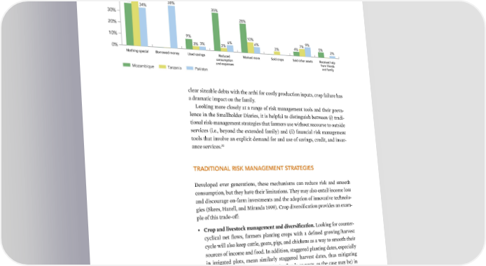 56 | SMALLHOLDER DIARIES FIGURE 29: Households that used these coping mechanisms when crops were destroyed by weather (Percentage; multiple answers allowed) 80% 72% 70% 60% 50% 40% 37% 38% 34% 35% 30% 28% 20% 10% 9% 10% 9% 6% 6% 4% 7% 5% 3% 3% 3% 3% 2% 0% Nothing specialBorrowed money Used savings Reduced Worked more Sold crops Sold other assets Received help consumption from friends and expenses and family Mozambique Tanzania Pakistan clear si—eable debts with the arthi for costly production inputs, crop failure has a dramatic impact on the family ƒooing more closely at a range of ris management tools and their preva- lence in the Smallholder ‰iaries, it is helpful to distinguish between (i) tradi- tional ris-management strategies that farmers use without recourse to outside services (ie, beyond the extended family) and (ii) financial ris management tools that involve an explicit demand for and use of savings, credit, and insur- Ÿ‘ ance services TRADITIONAL RISK MANAGEMENT STRATEGIES ‰eveloped over generations, these mechanisms can reduce ris and smooth consumption, but they have their limitations Œhey may also entail income loss and discourage on-farm investments and the adoption of innovative technolo- gies (Sees, Ha—ell, and –iranda …žžž) †rop diversification provides an exam- ple of this trade-off • ”rop and liestocƒ management and diersification ƒooing for counter- cyclical net flows, farmers planting crops with a defined growing¤harvest cycle will also eep cattle, goats, pigs, and chicens as a way to smooth their sources of income and food €n addition, staggered planting dates, especially in irrigated plots, mean similarly staggered harvest dates, thus mitigating riss such as unexpected drought (or floods or pests, as the case may be) in “ The number of crops I grow mid-season depends on the amount of †rop diversification is perhaps the most dominant strategy of agricultural money and capital I have, and ris prevention (Ha—ell, omareda, and §aldés …ž¡¢) †rop diversification, also depends on my health which could mean planting several crops instead of a single crop or planting the same crop in plots with different rainfall patterns, is intended to lower and the availability of labor.” the possibility that all crops will be affected by specific pests or price fluctua- —Smallholder respondent tions, but its main shortcoming is that the yields and profits from a diversi- in Tanzania fied crop portfolio are typically lower that those obtained from speciali—ing