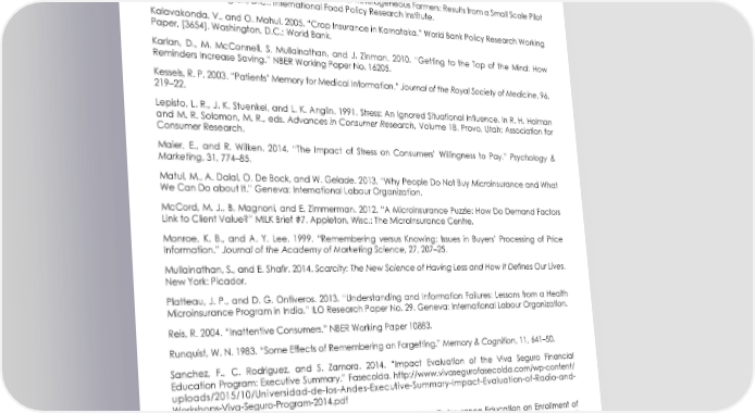 RESPONSIBLE BUNDLING OF MICROFINANCE SERVICES Hill, R. V., E. Zimmerman, and B. Magnoni. 2014. “Agricultural Insurance: High Potential but low Demand.” MILK Brief 34. Appleton, Wisc.: The Microinsurance Centre. Hill, R. V., and M. Robles. 2010. Flexible Insurance for Heterogeneous Farmers: Results from a Small Scale Pilot in Ethiopia. Washington, D.C.: International Food Policy Research Institute. Kalavakonda, V., and O. Mahul. 2005. “Crop Insurance in Karnataka.” World Bank Policy Research Working Paper, [3654]. Washington, D.C.: World Bank. Karlan, D., M. McConnell, S. Mullainathan, and J. Zinman. 2010. “Getting to the Top of the Mind: How Reminders Increase Saving.” NBER Working Paper No. 16205. Kessels, R. P. 2003. “Patients’ Memory for Medical Information.” Journal of the Royal Society of Medicine, 96, 219–22. Lepisto, L. R., J. K. Stuenkel, and L. K. Anglin. 1991. Stress: An Ignored Situational Influence. In R. H. Holman and M. R. Solomon, M. R., eds. Advances in Consumer Research, Volume 18. Provo, Utah: Association for Consumer Research. Maier, E., and R. Wilken. 2014. “The Impact of Stress on Consumers’ Willingness to Pay.” Psychology & Marketing, 31, 774–85. Matul, M., A. Dalal, O. De Bock, and W. Gelade. 2013. “Why People Do Not Buy Microinsurance and What We Can Do about It.” Geneva: International Labour Organization. McCord, M. J., B. Magnoni, and E. Zimmerman. 2012. “A Microinsurance Puzzle: How Do Demand Factors Link to Client Value?” MILK Brief #7. Appleton, Wisc.: The MicroInsurance Centre. Monroe, K. B., and A. Y. Lee. 1999. “Remembering versus Knowing: Issues in Buyers’ Processing of Price Information.” Journal of the Academy of Marketing Science, 27, 207–25. Mullainathan, S., and E. Shafir. 2014. Scarcity: The New Science of Having Less and How It Defines Our Lives. New York: Picador. Platteau, J. P., and D. G. Ontiveros. 2013. “Understanding and Information Failures: Lessons from a Health Microinsurance Program in India.” ILO Research Paper No. 29. Geneva: International Labour Organization. Reis, R. 2004. “Inattentive Consumers.” NBER Working Paper 10883. Runquist, W. N. 1983. “Some Effects of Remembering on Forgetting.” Memory & Cognition, 11, 641–50. Sanchez, F., C. Rodriguez, and S. Zamora. 2014. “Impact Evaluation of the Viva Seguro Financial Education Program: Executive Summary.” Fasecolda. http://www.vivasegurofasecolda.com/wp-content/ uploads/2015/10/Universidad-de-los-Andes-Executive-Summary-Impact-Evaluation-of-Radio-and- Workshops-Viva-Seguro-Program-2014.pdf Schultz, E., M. Metcalfe, and B. Gray. 2013. “The Impact of Health Insurance Education on Enrollment of Microfinance Institution Clients in the Ghana National Health Insurance Scheme, Northern Region of Ghana.” ILO Microinsurance Innovation Facility Research Paper No. 33. Geneva: International Labour Organization. Singh, S. N., S. Mishra, N. Bendapudi, and D. Linville. 1994. “Enhancing Memory of Television Commercials Through Message Spacing.” Journal of Marketing Research, 31, 384–92. 33
