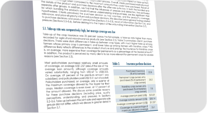 WORKING PAPER 5. Findings This section explores our study’s findings on clients’ insurance purchase decisions, perceptions, and understanding. Although overall take-up of the Crezcamos crop insurance compared favorably to take-up of similar insurance products in other countries, we found no statistically significant impact on take-up from separating the insurance offer from the loan application process. Overall, clients purchased relatively small amounts of coverage when compared to the maximum amounts they could have purchased. Recall of the details of the product and purchase decisions after the offer was quite low, in both the bundled and separate offer groups. In addition, we find that the influences of pressure and distraction, two pathways by which bundling the products could influence understanding and purchases, are less significant than hypothesized. Clients perceived the purchase decision as truly voluntary, and the product’s coverage, relevance, and price all greatly influenced purchase decisions. We describe below general findings related to purchase decisions and product perceptions (Sections 5.1–5.3), recall of information (Section 5.4), and pressure (Sections 5.5–5.6), before delving into the impact of the unbundling intervention (Section 5.7). 5.1. Take-up rate was comparatively high, but average coverage was low Take-up of the crop insurance was 23 percent across the full sample, a take-up rate higher than many recorded for agricultural microinsurance products (see Section 2.1). Table 3 summarizes clients’ purchase decisions. There were stark differences in take-up between crop types, with much higher take-up among farmers whose primary crop is permanent, and lower take-up among farmers with transitory crops.18 This difference likely reflects differences in the product structure and pricing: the insurance for transitory crops is, on average, more expensive than coverage for permanents as a percentage of the insured amount.19 In addition, the product is perceived by many clients to be more relevant for permanent crops for several reasons (see Section 5.3). Most policyholders purchased relatively small amounts Table 3. Insurance purchase decisions of coverage, on average US$1,257 (about the size of the average loan amount), although coverage amounts Purchased insurance varied substantially, ranging from US$167 to US$8,333. (% of full sample) 22.8 On average, 69 percent of the premium amount was subsidized, and policyholders paid US$13.51 out of pocket. Permanent crop owners who Policyholders purchased, on average, only a quarter of purchased (% of permanent 25.2 the maximum coverage allowed by the insurer for their crop owners) crops. Median coverage is even lower, at 17 percent of Transitory crop owners who the amount allowed. We discuss some possible reasons purchased (% of transitory 7.8 for these purchase decisions (including price, quality crop owners) perceptions, understanding, and pressure) in Sections Average premium paid (US$) $13.51 5.2–5.6. Take-up between the joint sale and separate sale Average subsidy amount (US$) $30.14 groups did not differ, which we discuss in greater detail in Section 5.7. Average coverage amount (US$) $1,257 Coverage as a percentage of 25.1 maximum allowed coverage 18. Differences between the two groups in amount of coverage and premium paid could not be analyzed due to the small number of purchasers for transitory crops. 19. Presubsidy premiums are 6–9 percent of the insured amount for transitory crops and are 3–4 percent of the insured amount for permanent crops; most transitory crops also have a lower premium subsidy than permanent. 16
