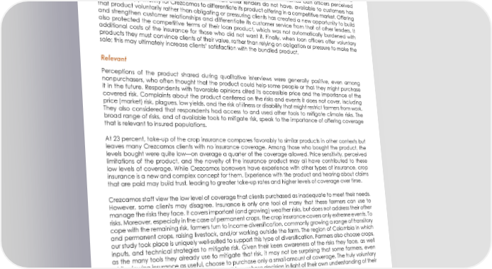WORKING PAPER in relation to their financial service providers by conveying the message that they can be trusted to make good decisions on their own behalf. Whether or not they purchased the crop insurance product, Crezcamos clients who had been offered it appreciated the offer and the loan officer’s respect for their decision. While the shift to voluntary sales is likely to decrease sales (and commissions) in the short term, it may lead to medium-term commercial gains for the financial service provider. Crezcamos loan officers perceived this shift positively. Making a new product, which other lenders do not have, available to customers has created an opportunity for Crezcamos to differentiate its product offering in a competitive market. Offering that product voluntarily rather than obligating or pressuring clients has created a new opportunity to build and strengthen customer relationships and differentiate its customer service from that of other lenders. It also protected the competitive terms of their loan product, which was not automatically burdened with additional costs of the insurance for those who did not want it. Finally, when loan officers offer voluntary products they must convince clients of their value, rather than relying on obligation or pressure to make the sale; this may ultimately increase clients’ satisfaction with the bundled product. Relevant Perceptions of the product shared during qualitative interviews were generally positive, even among nonpurchasers, who often thought that the product could help some people or that they might purchase it in the future. Respondents with favorable opinions cited its accessible price and the importance of the covered risk. Complaints about the product centered on the risks and events it does not cover, including price (market) risk, plagues, low yields, and the risk of illness or disability that might restrict farmers from work. They also considered that respondents had access to and used other tools to mitigate climate risks. The broad range of risks, and of available tools to mitigate risk, speak to the importance of offering coverage that is relevant to insured populations. At 23 percent, take-up of the crop insurance compares favorably to similar products in other contexts but leaves many Crezcamos clients with no insurance coverage. Among those who bought the product, the levels bought were quite low—on average a quarter of the coverage allowed. Price sensitivity, perceived limitations of the product, and the novelty of the insurance product may all have contributed to these low levels of coverage. While Crezcamos borrowers have experience with other types of insurance, crop with the product and hearing about claims insurance is a new and complex concept for them. Experience that are paid may build trust, leading to greater take-up rates and higher levels of coverage over time. Crezcamos staff view the low level of coverage that clients purchased as inadequate to meet their needs. However, some clients may disagree. Insurance is only one tool of many that these farmers can use to manage the risks they face. It covers important (and growing) weather risks, but does not address their other risks. Moreover, especially in the case of permanent crops, the crop insurance covers only extreme events. To cope with the remaining risk, farmers turn to income diversification, commonly growing a range of transitory and permanent crops, raising livestock, and/or working outside the farm. The region of Colombia in which our study took place is uniquely well-suited to support this type of diversification. Farmers also choose crops, inputs, and technical strategies to mitigate risk. Given their keen awareness of the risks they face, as well as the many tools they already use to mitigate that risk, it may not be surprising that some farmers, even while viewing insurance as useful, choose to purchase only a small amount of coverage. The truly voluntary insurance offer leaves farmers free to make this purchase decision in light of their own understanding of their risks and the tools available to mitigate them. 28