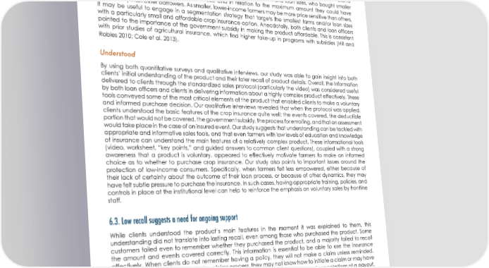 RESPONSIBLE BUNDLING OF MICROFINANCE SERVICES Affordable Cost was an important factor in customers’ purchase decisions, which suggest a high degree of price sensitivity that is consistent with prior studies of insurance demand. Lower take-up of the (more expensive) insurance for transitory crops is one reflection of this, as are the low levels of coverage that most clients purchased. Cost was particularly relevant for those with smaller farms and loan sizes, who bought smaller amounts of coverage (both in absolute size and in relation to the maximum amount they could have purchased) than other borrowers. As smaller, lower-income farmers may be more price sensitive than others, it may be useful to engage in a segmentation strategy that targets the smallest farms and/or loan sizes with a particularly small and affordable crop insurance option. Anecdotally, both clients and loan officers pointed to the importance of the government subsidy in making the product affordable. This is consistent with prior studies of agricultural insurance, which find higher take-up in programs with subsidies (Hill and Robles 2010; Cole et al. 2013). Understood By using both quantitative surveys and qualitative interviews, our study was able to gain insight into both clients’ initial understanding of the product and their later recall of product details. Overall, the information delivered to clients through the standardized sales protocol (particularly the video) was considered useful by both loan officers and clients in delivering information about a highly complex product effectively. These tools conveyed some of the most critical elements of the product that enabled clients to make a voluntary and informed purchase decision. Our qualitative interviews revealed that when the protocol was applied, clients understood the basic features of the crop insurance quite well: the events covered, the deductible portion that would not be covered, the government subsidy, the process for enrolling, and that an assessment would take place in the case of an insured event. Our study suggests that understanding can be tackled with appropriate and informative sales tools, and that even farmers with low levels of education and knowledge of insurance can understand the main features of a relatively complex product. These informational tools (video, worksheet, “key points,” and guided answers to common client questions), coupled with a strong awareness that a product is voluntary, appeared to effectively motivate farmers to make an informed choice as to whether to purchase crop insurance. Our study also points to important issues around the protection of low-income consumers. Specifically, when farmers felt less empowered, either because of their lack of certainty about the outcome of their loan process, or because of other dynamics, they may have felt subtle pressure to purchase the insurance. In such cases, having appropriate training, policies, and controls in place at the institutional level can help to reinforce the emphasis on voluntary sales by frontline staff. 6.3. Low recall suggests a need for ongoing support While clients understood the product’s main features in the moment it was explained to them, this understanding did not translate into lasting recall, even among those who purchased the product. Some customers failed even to remember whether they purchased the product, and a majority failed to recall the amount and events covered correctly. This information is essential to be able to use the insurance effectively. When clients do not remember having a policy, they will not make a claim unless reminded. When clients are not familiar with the claims process, they may not know how to initiate a claim or may have unrealistic expectations about a payout that is due. When clients have incorrect expectations of a payout, they may be disappointed to later receive a much lower amount. And when clients do not remember the insurance policy’s term or know how to renew, they may unintentionally experience a lapse in coverage. 29