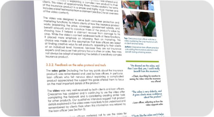 RESPONSIBLE BUNDLING OF MICROFINANCE SERVICES 3.3.1. A video tool to standardize sales and support loan officers A brief video on the crop insurance was developed through a collaboration among Crezcamos, Mapfre, and our research team. This video was installed on loan officers’ company-provided smartphones. It was shown to clients as part of the insurance offer with the aim of standardizing the way the product was offered and aiding loan officers in explaining a complex new product to their clients. This video of approximately three minutes explains the terms of the insurance product in a simple and highly visual manner and includes a brief testimonial from a claimant (see Box 2 for an overview of the video content). The video was designed to serve both consumer protection and marketing functions: to inform clients of how the insurance product works (explaining the price, coverage, government subsidy, and benefit amount) and to convince them of the product’s value by showing how it helped a claimant recover from damage to his crop. While the video’s content addressed both of these functions, Top: Crezcamos loan officer watches a it placed more emphasis on informing than on marketing. This video explaining the crop insurance with choice was made on the assumption that loan officers are adept a client and her family. at finding creative ways to sell products, appealing to their clients Bottom: Crezcamos loan officers practice at an individual level. However, because they are not insurance calculating the insurance premium and experts and because their primary focus is often on sales, they may benefit during a training session. not always be adept at explaining the details of a relatively complex insurance product. 3.3.2. Feedback on the sales protocol and tools “He showed me the video, and The sales guide (including the four key points about the insurance then I saw that, yes, I could really product) was remembered and used by loan officers. In particular, benefit from this insurance.” loan officers who felt nervous about explaining a complicated —Client, describing his reaction to product appreciated the support this guide offered them to focus seeing the video when the insurance on the most important details of the product. was offered The video was very well received by both clients and loan officers. Crezcamos has updated and is continuing to use the video after “The video is very didactic, and completing the fieldwork and is considering creating similar tools it gives clients more confidence for other products. Our qualitative interviews suggest that product about the product.” details explained in the video were more likely to be understood and —Loan officer, reflecting on how the remembered by clients than when this information was relayed by video supports sales the loan officer (see Section 5). Although some loan officers preferred not to use the video for all clients, there was general agreement that it offered a clear “Clients like the video and it helps explanation of the product, which was useful to support an informed them understand the product, but purchase decision. Some Crezcamos staff felt that the video would they don’t really pay attention to be more effective if it conveyed a more powerful emotional message the calculations.” about the consequences of not having insurance protection. Others, —Loan officer, explaining how the however, appreciated that the video did not make a “hard” sell. video supports client understanding Several noted that it was a good way to introduce prospective clients (vs. other tools) showing to Crezcamos, by them a new and unexpected product and explaining it clearly. 11