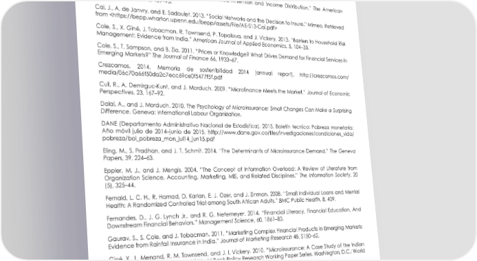 WORKING PAPER References Banerjee, A., E. Duflo, and R. Hornbeck. 2014. “Bundling Health Insurance and Microfinance in India: There Cannot Be Adverse Selection If There Is No Demand.” American Economic Review, 104, 291–7. Banerjee, A. V., and S. Mullainathan. 2008. “Limited Attention and Income Distribution.” The American Economic Review, 98, 489–93. Cai, J., A. de Janvry, and E. Sadoulet. 2013. “Social Networks and the Decision to Insure.” Mimeo. Retrieved from Cole, S., X. Giné, J. Tobacman, R. Townsend, P. Topalova, and J. Vickery. 2013. “Barriers to Household Risk Management: Evidence from India.” American Journal of Applied Economics, 5, 104–35. Cole, S., T. Sampson, and B. Zia. 2011. “Prices or Knowledge? What Drives Demand for Financial Services in Emerging Markets?” The Journal of Finance 66, 1933–67. Crezcamos. 2014. Memoria de sostenibilidad 2014 [annual report]. http://crezcamos.com/ media/06c70a66f50da2c7ecc69ce0f5477f5f.pdf Cull, R., A. Demirguc-Kunt, and J. Morduch. 2009. “Microfinance Meets the Market.” Journal of Economic Perspectives, 23, 167–92. Dalal, A., and J. Morduch. 2010. The Psychology of Microinsurance: Small Changes Can Make a Surprising Difference. Geneva: International Labour Organization. DANE (Departamento Administrativo Nacional de Estadística). 2015. Boletín tecnico: Pobreza monetaria: Año móvil julio de 2014–junio de 2015. http://www.dane.gov.co/files/investigaciones/condiciones_vida/ pobreza/bol_pobreza_mon_jul14_jun15.pdf Eling, M., S. Pradhan, and J. T. Schmit. 2014. “The Determinants of Microinsurance Demand.” The Geneva Papers, 39, 224–63. Eppler, M. J., and J. Mengis. 2004. “The Concept of Information Overload: A Review of Literature from Organization Science, Accounting, Marketing, MIS, and Related Disciplines.” The Information Society, 20 (5), 325–44. Fernald, L. C. H., R. Hamad, D. Karlan, E. J. Ozer, and J. Zinman. 2008. “Small Individual Loans and Mental Health: A Randomized Controlled Trial among South African Adults.” BMC Public Health, 8, 409. Fernandes, D., J. G. Lynch Jr., and R. G. Netemeyer. 2014. “Financial Literacy, Financial Education, And Downstream Financial Behaviors.” Management Science, 60, 1861–83. Gaurav, S., S. Cole, and J. Tobacman. 2011. “Marketing Complex Financial Products in Emerging Markets: Evidence from Rainfall Insurance in India.” Journal of Marketing Research 48, S150–62. Giné, X., L. Menand, R. M. Townsend, and J. I. Vickery. 2010. “Microinsurance: A Case Study of the Indian Rainfall Index Insurance Market.” World Bank Policy Research Working Paper Series. Washington, D.C.: World Bank. Giné, X., and D. Yang. 2009. “Insurance, Credit, and Technology Adoption: Field Experimental Evidence from Malawi.” Journal of Development Economics, 89, 1–11. Giné, X., Townsend, R. and Vickery, J. 2008. “Patterns of Rainfall Insurance Participation in Rural India” The World Bank Economic Review, Vol. 22, Nr. 3, pp. 539–66: Advance Access Publication. 32