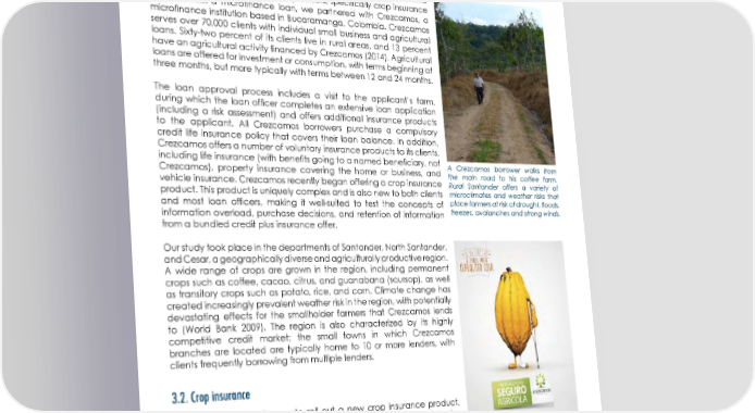 WORKING PAPER 3. Selecting a Financial Service Partner in Rural Colombia 3.1. Crezcamos To better understand some of the influences and perceptions behind the purchase decision of bundled products, specifically crop insurance bundled with a microfinance loan, we partnered with Crezcamos, a microfinance institution based in Bucaramanga, Colombia. Crezcamos serves over 70,000 clients with individual small business and agricultural loans. Sixty-two percent of its clients live in rural areas, and 13 percent have an agricultural activity financed by Crezcamos (2014). Agricultural loans are offered for investment or consumption, with terms beginning at three months, but more typically with terms between 12 and 24 months. The loan approval process includes a visit to the applicant’s farm, during which the loan officer completes an extensive loan application (including a risk assessment) and offers additional insurance products to the applicant. All Crezcamos borrowers purchase a compulsory credit life insurance policy that covers their loan balance. In addition, Crezcamos offers a number of voluntary insurance products to its clients, including life insurance (with benefits going to a named beneficiary, not A Crezcamos borrower walks from Crezcamos), property insurance covering the home or business, and the main road to his coffee farm. vehicle insurance. Crezcamos recently began offering a crop insurance Rural Santander offers a variety of product. This product is uniquely complex and is also new to both clients microclimates and weather risks that and most loan officers, making it well-suited to test the concepts of place farmers at risk of drought, floods, information overload, purchase decisions, and retention of information freezes, avalanches and strong winds. from a bundled credit plus insurance offer. Our study took place in the departments of Santander, North Santander, and Cesar, a geographically diverse and agriculturally productive region. A wide range of crops are grown in the region, including permanent crops such as coffee, cacao, citrus, and guanabana (soursop), as well as transitory crops such as potato, rice, and corn. Climate change has created increasingly prevalent weather risk in the region, with potentially devastating effects for the smallholder farmers that Crezcamos lends to (World Bank 2009). The region is also characterized by its highly competitive credit market; the small towns in which Crezcamos branches are located are typically home to 10 or more lenders, with clients frequently borrowing from multiple lenders. 3.2. Crop insurance In 2014, Crezcamos began to roll out a new crop insurance product, which is underwritten by the insurer Mapfre and designed to be appropriate for the small farmers who comprise Crezcamos’s client base. The insurance covers natural disaster risk for a variety of crops that are common in the region (though several common crops are excluded); all loan applicants who have an insurable crop are eligible to enroll. Nonborrowers, including applicants whose loans are denied, are also Promotional materials for the insurance eligible. Clients may purchase coverage for multiple crops, although caution customers that “anything most typically insure only one principal crop. could happen to your crop.” 8