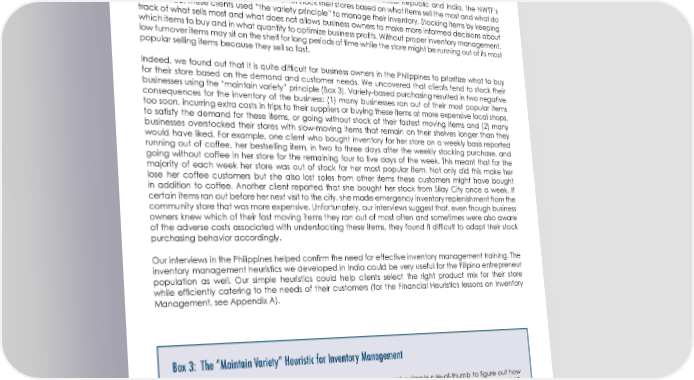 USING BEHAVIORAL SCIENCE TO DESIGN A CUSTOMER-CENTRIC FINANCIAL MANAGEMENT TRAINING FOR MICROENTREPRENEURS customer credit issues in the Philippines context (for the Financial Heuristics lessons on Customer Credit, see Appendix A). 4.1.6. Clients Use the Variety Principle to Buy Stock for Their Business Similar to what we observed for the microentrepreneurs in the Dominical Republic and India, the NWTF’s retail business clients we interviewed did not stock their stores based on what items sell the most and what do not. Instead, these clients used “the variety principle” to manage their inventory. Stocking items by keeping track of what sells most and what does not allows business owners to make more informed decisions about which items to buy and in what quantity to optimize business profits. Without proper inventory management, low turnover items may sit on the shelf for long periods of time while the store might be running out of its most popular selling items because they sell so fast. Indeed, we found out that it is quite difficult for business owners in the Philippines to prioritize what to buy for their store based on the demand and customer needs. We uncovered that clients tend to stock their businesses using the “maintain variety” principle (Box 3). Variety-based purchasing resulted in two negative consequences for the inventory of the business: (1) many businesses ran out of their most popular items too soon, incurring extra costs in trips to their suppliers or buying these items at more expensive local shops, to satisfy the demand for these items, or going without stock of their fastest moving items and (2) many businesses overstocked their stores with slow-moving items that remain on their shelves longer than they would have liked. For example, one client who bought inventory for her store on a weekly basis reported running out of coffee, her bestselling item, in two to three days after the weekly stocking purchase, and going without coffee in her store for the remaining four to five days of the week. This meant that for the majority of each week her store was out of stock for her most popular item. Not only did this make her lose her coffee customers but she also lost sales from other items these customers might have bought in addition to coffee. Another client reported that she bought her stock from Silay City once a week. If certain items ran out before her next visit to the city, she made emergency inventory replenishment from the community store that was more expensive. Unfortunately, our interviews suggest that, even though business owners knew which of their fast moving items they ran out of most often and sometimes were also aware of the adverse costs associated with understocking these items, they found it difficult to adapt their stock purchasing behavior accordingly. Our interviews in the Philippines helped confirm the need for effective inventory management training. The inventory management heuristics we developed in India could be very useful for the Filipino entrepreneur population as well. Our simple heuristics could help clients select the right product mix for their store while efficiently catering to the needs of their customers (for the Financial Heuristics lessons on Inventory Management, see Appendix A). Box 3: The “Maintain Variety” Heuristic for Inventory Management To implement the “maintain variety” heuristic, business owners used a simple rule-of-thumb to figure out how much to buy of each good—namely, “get 12 of everything.” Many clients reported buying in packs of 12, regardless of the demand for each item. For example, one of the women reported buying in packs of 12 “because they look pretty on display.” With such suboptimal inventory management practices, clients reported often running out of their most popular items in the store, while slow-moving items that were not particularly popular remained on the shelf for a long time—locking business owners’ capital for further inventory purchases. 15