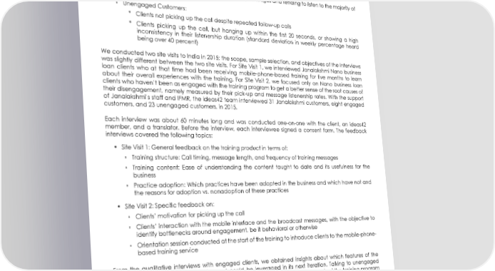 WORKING PAPER • Janalakshmi’s Nano business loan customers from the Bangalore metropolitan area who were receiving the mobile-phone-based training as part of Phase 2 pilot • The additional criterion we used focused on client’s engagement level with the training product ▫ Engaged Customers: * Clients picking up the phones for the training messages and tending to listen to the majority of the messages ▫ Unengaged Customers: * Clients not picking up the call despite repeated follow-up calls * Clients picking up the call, but hanging up within the first 20 seconds, or showing a high inconsistency in their listenership duration (standard deviation in weekly percentage heard being over 40 percent) We conducted two site visits to India in 2015; the scope, sample selection, and objectives of the interviews was slightly different between the two site visits. For Site Visit 1, we interviewed Janalakshmi Nano business loan clients who at that time had been receiving mobile-phone-based training for five months to learn about their overall experiences with the training. For Site Visit 2, we focused only on Nano business loan clients who haven’t been as engaged with the training program to get a better sense of the root causes of their disengagement, namely measured by their pick-up and message listenership rates. With the support of Janalakshmi’s staff and IFMR, the ideas42 team interviewed 31 Janalakshmi customers, eight engaged customers, and 23 unengaged customers, in 2015. Each interview was about 60 minutes long and was conducted one-on-one with the client, an ideas42 member, and a translator. Before the interview, each interviewee signed a consent form. The feedback interviews covered the following topics: • Site Visit 1: General feedback on the training product in terms of: ▫ Training structure: Call timing, message length, and frequency of training messages ▫ Training content: Ease of understanding the content taught to date and its usefulness for the business ▫ Practice adoption: Which practices have been adopted in the business and which have not and the reasons for adoption vs. nonadoption of these practices • Site Visit 2: Specific feedback on: ▫ Clients’ motivation for picking up the call ▫ Clients’ interaction with the mobile interface and the broadcast messages, with the objective to identify bottlenecks around engagement, be it behavioral or otherwise ▫ Orientation session conducted at the start of the training to introduce clients to the mobile-phone- based training service From the qualitative interviews with engaged clients, we obtained insights about which features of the Phase 2 training design are working and could be leveraged in its next iteration. Talking to unengaged clients gave us an opportunity to probe and understand in detail that specific parts of the training program that did not work for them; this gave the team useful insights and design ideas for tweaks to the training content and delivery structure for the next iteration of the training product. We also were able to deepen our understanding of financial management practices among Indian retail businesses and gain insight about their level of understanding and adoption of heuristics-based financial management practices we taught via the mobile training. The key findings from the site visits are presented in the following section. them 10