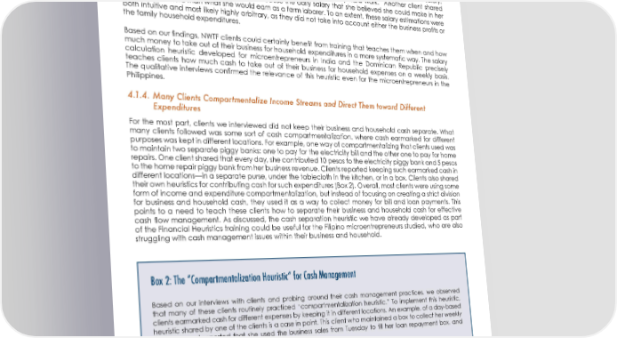 USING BEHAVIORAL SCIENCE TO DESIGN A CUSTOMER-CENTRIC FINANCIAL MANAGEMENT TRAINING FOR MICROENTREPRENEURS income sources to pay for their household expenses. On the other hand, a few clients did take out a fixed “salary” amount daily from their business income to pay for their household needs, but they did not have a good way to assess if it indeed was the right amount of money to take out. One client believed that her daily salary from her business should be 300 pesos, because she got paid 500 pesos per day as a cook for other people on very special occasions. Another client reported that if she was to pay herself a salary, it would be 400 pesos per day because running a store is “really very hard work.” Another client shared that she was doing the sari-sari business because the daily salary that she believed she could make in her business was more than what she would earn as a farm laborer. To an extent, these salary estimations were both intuitive and most likely highly arbitrary, as they did not take into account either the business profits or the family household expenditures. Based on our findings, NWTF clients could certainly benefit from training that teaches them when and how much money to take out of their business for household expenditures in a more systematic way. The salary calculation heuristic developed for microentrepreneurs in India and the Dominican Republic precisely teaches clients how much cash to take out of their business for household expenses on a weekly basis. The qualitative interviews confirmed the relevance of this heuristic even for the microentrepreneurs in the Philippines. 4.1.4. Many Clients Compartmentalize Income Streams and Direct Them toward Different Expenditures For the most part, clients we interviewed did not keep their business and household cash separate. What many clients followed was some sort of cash compartmentalization, where cash earmarked for different purposes was kept in different locations. For example, one way of compartmentalizing that clients used was to maintain two separate piggy banks: one to pay for the electricity bill and the other one to pay for home repairs. One client shared that every day, she contributed 10 pesos to the electricity piggy bank and 5 pesos to the home repair piggy bank from her business revenue. Clients reported keeping such earmarked cash in different locations—in a separate purse, under the tablecloth in the kitchen, or in a box. Clients also shared their own heuristics for contributing cash for such expenditures (Box 2). Overall, most clients were using some form of income and expenditure compartmentalization, but instead of focusing on creating a strict division for business and household cash, they used it as a way to collect money for bill and loan payments. This points to a need to teach these clients how to separate their business and household cash for effective cash flow management. As discussed, the cash separation heuristic we have already developed as part of the Financial Heuristics training could be useful for the Filipino microentrepreneurs studied, who are also struggling with cash management issues within their business and household. Box 2: The “Compartmentalization Heuristic” for Cash Management Based on our interviews with clients and probing around their cash management practices, we observed that many of these clients routinely practiced “compartmentalization heuristic.” To implement this heuristic, clients earmarked cash for different expenses by keeping it in different locations. An example, of a day-based heuristic shared by one of the clients is a case in point. This client who maintained a box to collect her weekly loan payment reported that she used the business sales from Tuesday to fill her loan repayment box, and collect the necessary payment amount by Thursday. We also encountered compartmentalization heuristic based on income stream—one client reported saving for her monthly electricity bill from two income streams, her sari-sari store income and her gasoline retailing business, by allocating 10 pesos every day from the earnings of each of these two businesses toward her electricity bill. Although practicing such heuristics helps clients be prepared to make timely payments of their expenses, such as a loans or an electricity bill, the lack of strict division between business and household cash makes it harder for clients to know how well their business is performing, and respond accordingly. 13