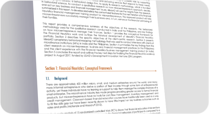 USING BEHAVIORAL SCIENCE TO DESIGN A CUSTOMER-CENTRIC FINANCIAL MANAGEMENT TRAINING FOR MICROENTREPRENEURS Introduction There has been growing momentum to design financial and nonfinancial services for lower-income populations around the world that would meet the specific needs of these clients. CGAP’s “Clients at the Center Financial Inclusion Research Fund” (Fund) has been playing a catalytic role by supporting research focusing on understanding clients’ needs and delivering services that respond to these needs. CGAP engaged ideas42, a behavioral design firm, to apply its research methodology, which is founded in behavioral science, to conduct a qualitative research on how microentrepreneurs approach, decide, and act on key business and financial management issues. ideas42 will use the insights from the research, summarized in this report, to develop and refine the content and features for the next iteration of its Financial Heuristics financial management training product for microentrepreneurs. This improved product will help microentrepreneurs successfully manage their businesses and, in turn, enhance the financial well-being of their families. This report provides a comprehensive summary of the objectives of the research, the behavioral methodology used for the qualitative research conducted in India and the Philippines, and key findings on how microentrepreneurs manage their finances. Section 1 provides the conceptual framework for the Financial Heuristics work and outlines the historical development of ideas42’s Financial Heuristics portfolio. Section 2 describes the specific objectives of the client-centric research. Section 3 presents ideas42’s proprietary behavioral mapping methodology that was used to conduct interviews with clients of microfinance institutions (MFIs) in India and the Philippines. Section 4 summarizes the key findings from the client research on microentrepreneurs’ business and financial management practices (in the Philippines) and the client experience with the Financial Heuristics business management training product (in India). Section 5 concludes the report and outlines the key next steps for finalizing the Financial Heuristics scale-up project in August 2017, funded by USAID’s Development Innovation Ventures (DIV) program. Section 1: Financial Heuristics: Conceptual Framework 1.1. Background There are approximately 400 million micro, small, and medium enterprises around the world, and many more informal entrepreneurs who derive a portion of their income through some form of entrepreneurial activity, yet these individuals have no training or support to help them manage the complex finances of a small enterprise. The microfinance industry has made progress providing greater access to formal financial products, but microentrepreneurs have no tools for cash flow management, inventory management, and credit management. Classroom-based financial education courses have traditionally been used as a way to fill the skills gap but have been recently shown to have little impact on key business outcomes such as sales and profits (McKenzie and Woodruff 2012). In fact, meta-analysis of 15 randomized controlled trials (RCTs) shows that financial education interventions can be attributed to less than a 1 percent change in the financial behaviors of participants compared to a control group, with even weaker effects in lower-income samples (Fernandes et al. 2014). From a behavioral perspective, increased knowledge alone does not always translate into improved decisions or behaviors. This insight points to alternative ways to deliver financial literacy training. Reducing content complexity and replacing classroom-based delivery with a lighter-touch method offer fresh promise for improving business decisions and outcomes. ideas42 works to achieve this by developing simplified content and a more cost- effective and direct delivery channel for financial literacy trainings. 1