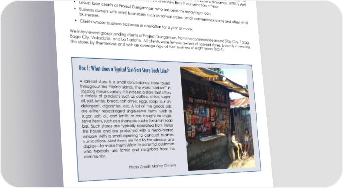 WORKING PAPER 3.3.1. Qualitative Interviews in the Philippines: Client Selection and Interview Methodology Our first step in structuring our client interviews in the Philippines was to select who we would like to interview. The criteria we used for selecting target interview clients were the same as those we are using for selecting clients for the business training intervention. Even though it was not an explicit selection criterion, we interviewed exclusively female microentrepreneurs given that NWTF’s client base is all women. NWTF’s staff was instrumental in helping us identify 32 clients to interview that fit our selection criteria: 1 • Group loan clients of Project Dungannon who are currently repaying a loan. • Business owners with retail businesses such as sari-sari stores (small convenience store) and other retail businesses. • Clients whose business has been in operation for a year or more. We interviewed group lending clients of Project Dungannon, from the communities around Silay City, Patag, Bago City, Valladolid, and La Carlotta. All clients were female owners of sari-sari stores, typically operating the stores by themselves and with an average age of their business of eight years (Box 1). Box 1: What does a Typical Sari-Sari Store Look Like? A sari-sari store is a small convenience store found throughout the Filipino islands. The word “sari-sari” in Tagalog means variety. It is indeed a store that offers a variety of products such as coffee, chips, sugar, oil, salt, lentils, bread, soft drinks, eggs, soap, laundry detergent, cigarettes, etc. A lot of the goods sold are either repackaged single-serve items, such as sugar, salt, oil, and lentils, or are bought as single- serve items, such as a shampoo sachet or a mini soap bar. Such stores are typically operated from inside the house and are protected with a metal-barred window with a small opening to conduct business transactions. Most items are tied to the window as a display—to make them visible to potential customers who typically are family and neighbors from the community. Photo Credit: Marina Dimova 1. NWTF’s Project Dungganon aims to help marginalized women, from rural and urban communities, by providing them with training and group-based credit to maintain or start their own small business ventures. 8