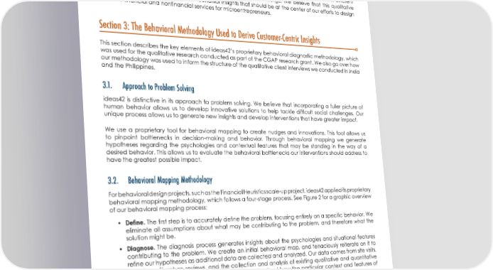WORKING PAPER The key findings from ideas42’s qualitative research, summarized in Section 4, have played an important two- fold role: (1) expanding the understanding of financial inclusion practitioners about how microentrepreneurs manage their finances, and (2) deriving key insights about how nonfinancial service products should be designed to fit the needs of their target customers. The research has also helped ideas42 develop a more effective way to design and deliver the Financial Heuristics mobile-phone-based training across different target populations and in different geographical and cultural settings. We believe that this qualitative research provides valuable customer behavior insights that should be at the center of our efforts to design effective financial and nonfinancial services for microentrepreneurs. Section 3: The Behavioral Methodology Used to Derive Customer-Centric Insights This section describes the key elements of ideas42’s proprietary behavioral diagnostic methodology, which was used for the qualitative research conducted as part of the CGAP research grant. We also go over how our methodology was used to inform the structure of the qualitative client interviews we conducted in India and the Philippines. 3.1. Approach to Problem Solving ideas42 is distinctive in its approach to problem solving. We believe that incorporating a fuller picture of human behavior allows us to develop innovative solutions to help tackle difficult social challenges. Our unique process allows us to generate new insights and develop interventions that have greater impact. We use a proprietary tool for behavioral mapping to create nudges and innovations. This tool allows us to pinpoint bottlenecks in decision-making and behavior. Through behavioral mapping we generate hypotheses regarding the psychologies and contextual features that may be standing in the way of a desired behavior. This allows us to evaluate the behavioral bottlenecks our interventions should address to have the greatest possible impact. 3.2. Behavioral Mapping Methodology For behavioral design projects, such as the Financial Heuristics scale-up project, ideas42 applied its proprietary behavioral mapping methodology, which follows a four-stage process. See Figure 2 for a graphic overview of our behavioral mapping process: • Define. The first step is to accurately define the problem, focusing entirely on a specific behavior. We eliminate all assumptions about what may be contributing to the problem, and therefore what the solution might be. • Diagnose. The diagnosis process generates insights about the psychologies and situational features contributing to the problem. We create an initial behavioral map, and tenaciously reiterate on it to refine our hypotheses as additional data are collected and analyzed. Our data comes from site visits, interviews, literature reviews, and the collection and analysis of existing qualitative and quantitative information. The insights we generate look specifically at how the particular context and features of the environment can create behavioral bottlenecks. • Design. Drawing on the diagnosis, we design scalable interventions that address the key bottlenecks. Designs range from small-scale changes to existing programs and products to more complex interventions. We then work closely with partners to finalize and implement the design. • Test. To determine the validity of our hypotheses and the efficacy of the design, we rigorously test interventions—ideally through an RCT, the gold standard in evaluations. 6