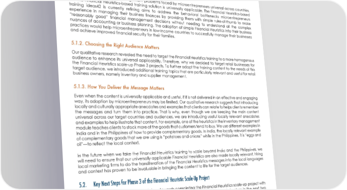 USING BEHAVIORAL SCIENCE TO DESIGN A CUSTOMER-CENTRIC FINANCIAL MANAGEMENT TRAINING FOR MICROENTREPRENEURS financial management challenges faced by microentrepreneurs in the Philippines are very similar to what we had observed earlier in the Dominican Republic and India. We also found that, like in India and the Dominican Republic, microentrepreneurs in the Philippines struggle to successfully adopt improved financial management behaviors as the psychology of scarcity acts to focus their attention to confront everyday needs. Not only are the financial management problems faced by microentrepreneurs universal across countries, but the Financial Heuristics-based training solution is universally applicable. The Financial Heuristics-based training ideas42 is currently refining aims to address the behavioral bottlenecks microentrepreneurs experience in managing their business finances by providing them with simple rules-of-thumb to make “reasonably good” financial management decisions without needing to understand all the complex nuances of accounting or business planning. The adoption of simple Financial Heuristics into their business practices would help microentrepreneurs in low-income countries to successfully manage their businesses and achieve improved financial security for their families. 5.1.2. Choosing the Right Audience Matters Our qualitative research revealed the need to target the Financial Heuristics training to a more homogenous audience to enhance its universal applicability. Therefore, why we decided to target retail businesses for the Financial Heuristics scale-up Phase 3 projects. To further adapt the training content to the needs of this target audience, we introduced additional training topics that are particularly relevant and useful for retail business owners, namely inventory and supplier management. 5.1.3. How You Deliver the Message Matters Even when the content is universally applicable and useful, if it is not delivered in an effective and engaging way, its adoption by microentrepreneurs may be limited. Our qualitative research suggests that introducing locally and culturally appropriate anecdotes and examples that clients can relate to helps clients remember the messages and turn them into practice. That is why, even though we are keeping the main content universal across our target countries and audiences, we are introducing useful locally relevant anecdotes and examples to help illustrate that content. For example, one of the heuristics in the inventory management module teaches clients to stock more of the goods that customers tend to buy. We use different examples in India and in the Philippines of how to provide complementary goods. In India, the locally relevant example of complementary goods that we are using is “potatoes and onions” while in the Philippines, it is “eggs and oil”—to reflect the local context. In the future when we take the Financial Heuristics training to scale beyond India and the Philippines, we will need to ensure that our universally applicable Financial Heuristics are also made locally relevant. Hiring local marketing firms to do the transliteration of the Financial Heuristics messages into the local languages and context has proven to be invaluable in bringing the content to life for the target audiences. 5.2. Key Next Steps for Phase 3 of the Financial Heuristic Scale-Up Project This section summarizes the key next steps towards completing the Financial Heuristics scale-up project with the support from USAID’s DIV program. After we finalize the training content and structure in the next two months, we will launch the training intervention in June 2016, and evaluate its effectiveness on key business and financial management outcomes for microentrepreneurs with two RCTs conducted in India and the Philippines. We plan to complete the Phase 3 projects at the end of August 2017. 27