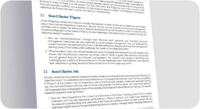 USING BEHAVIORAL SCIENCE TO DESIGN A CUSTOMER-CENTRIC FINANCIAL MANAGEMENT TRAINING FOR MICROENTREPRENEURS Section 2: Objectives for the CGAP Research Work Conducted as Part of Phase 3— Financial Heuristics Scale-Up With the support of CGAP’s Fund, ideas42 executed a deep-dive formative customer-centric research in India and the Philippines. The objectives of the research in India and the Philippines for Phase 3 were different, as we had already conducted a lot of the primary research about how microentrepreneurs manage their finances in India in Phase 2 of the project. On the other hand, the Philippines was a new country to the Financial Heuristics portfolio, so we started with the formative research stage in the Philippines. The research objectives for Phase 3 for each country are laid out in the following. 2.1. Research Objectives: Philippines In the Philippines, where the Financial Heuristics training has not been tested yet, our objective was to learn about how microentrepreneurs approach, decide, and act on key business and financial management activities and to assess the relevance of already developed Financial Heuristics content for India and the Dominican Republic to the needs of Filipino microentrepreneurs. We approached our research through the following research questions: 1. How do microentrepreneurs manage their finances—both personal and business? Financial management behaviors are very important to sound business management. Thus, an assessment of current financial management practices is critical for effectively designing the financial management training product that adequately addresses the needs of the target population. 2. What heuristics, if any, do microentrepreneurs use in managing their finances? Our prior research has shown that microfinance customers use simple rules of thumb to guide their decisions and actions around general financial and business management. Our research also aimed at identifying and cataloging any additional financial heuristics microentrepreneurs use in the Philippines, and assessing their usefulness in guiding beneficial financial behaviors for the target population. 2.2. Research Objectives: India In India, where we have already implemented the mobile-phone-based financial management training, our objective wasn’t to understand how microentrepreneurs manage their finances—work we had completed in Phase 2 of the project—but to assess how users of the Financial Heuristics mobile-phone-based training use the tool and interact with the rules of thumb being taught. For that purpose, we conducted research with engaged and unengaged clients of the mobile-phone-based Financial Heuristics training. Our specific research questions were as follows: 1. How do clients experience the content and structure of the Phase 2 training product? Our in-depth interviews with microentrepreneurs participating in Phase 2 allowed us to collect user feedback on the ease of understanding and usefulness of the Financial Heuristics content for their business. We also gathered insights around the general training structure, namely, message length, message frequency, and language. 2. What components of the training drive client engagement and persistence through the training? We also conducted research to understand what drives pick-up and listenership rates for clients. Based on the insights from engaged and unengaged training participants, we were able to identify key features of the training that drive client engagement, and derive invaluable design implications for improving the design of the training product for Phase 3, to make it better fit the needs and context of the target audience. 5
